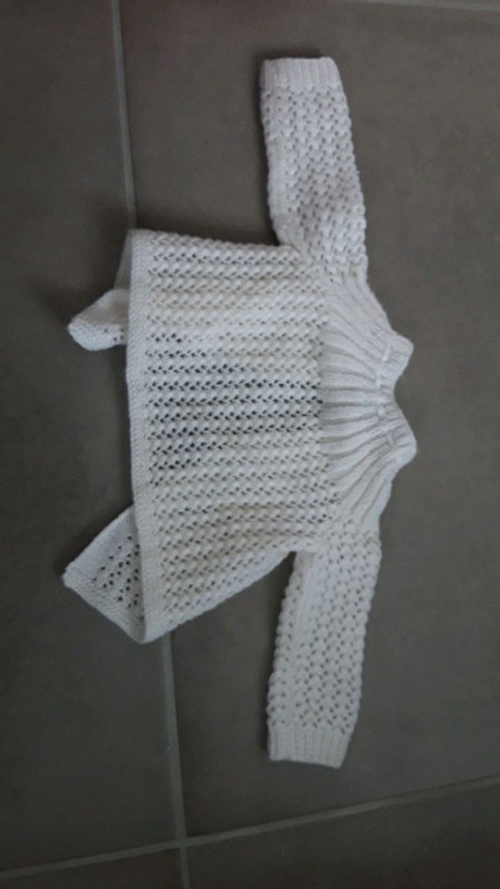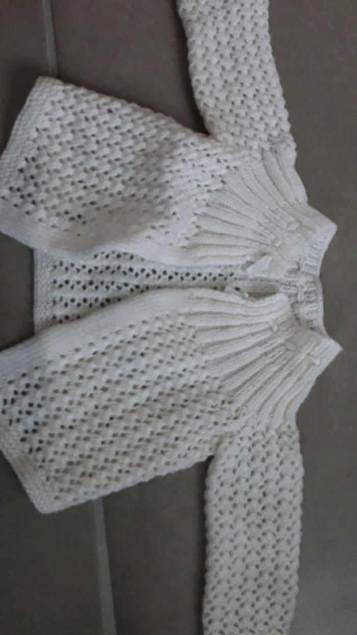 Bonjour, Je vends une Brassière/gilet tricoté de couleur blanc/écru sans pression ni bouton idéal pour la naissance de bébé couleur mixte.