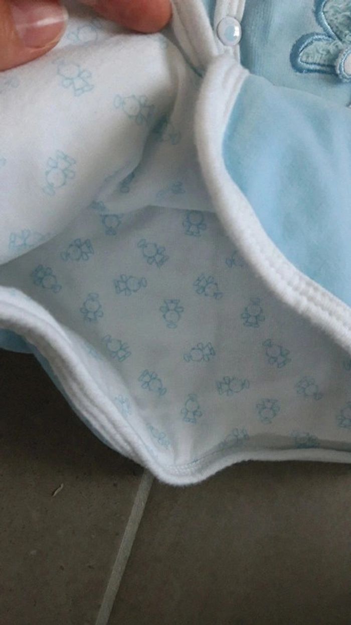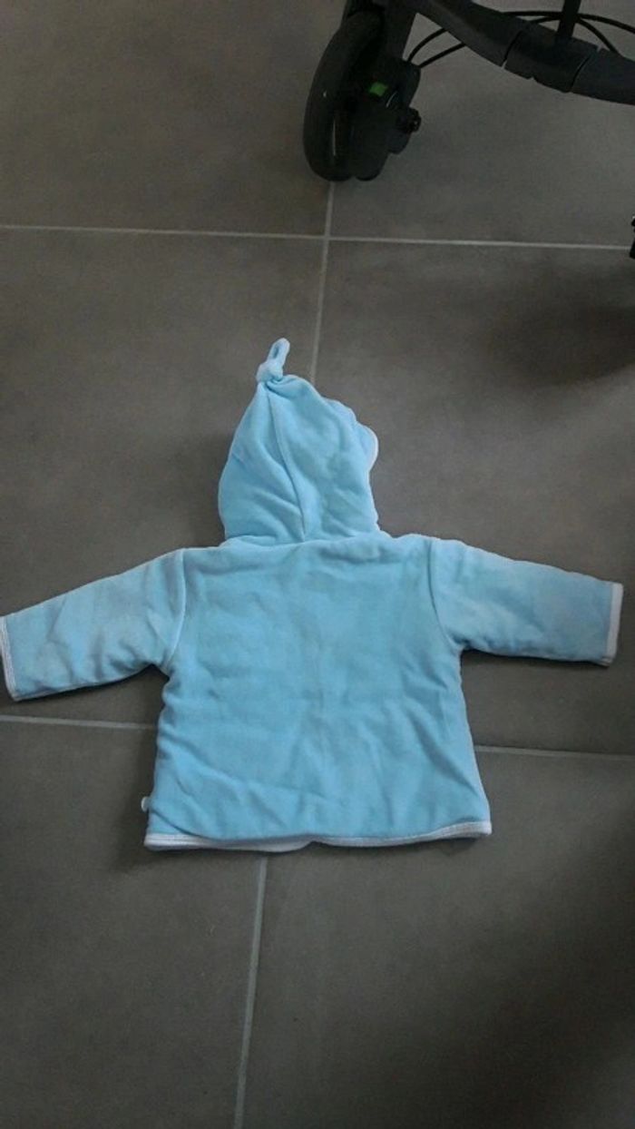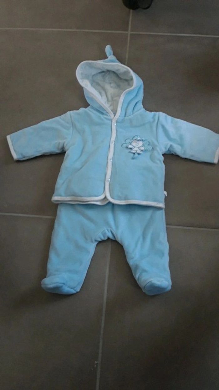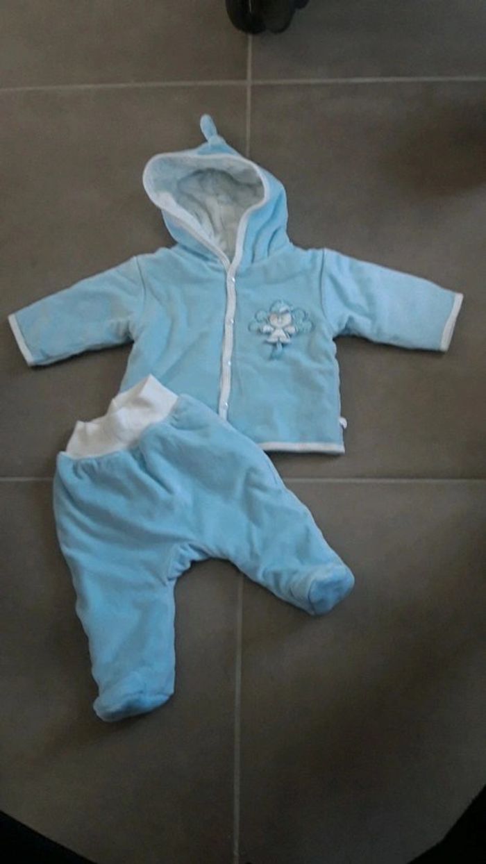 Bonjour, Je vends un ensemble bleu composé de sa veste/gilet chaud et de son pantalon et son tee-shirt (petit accro voir photo) taille 3 mois marque orchestra. Il est en très bon état et très chaud.