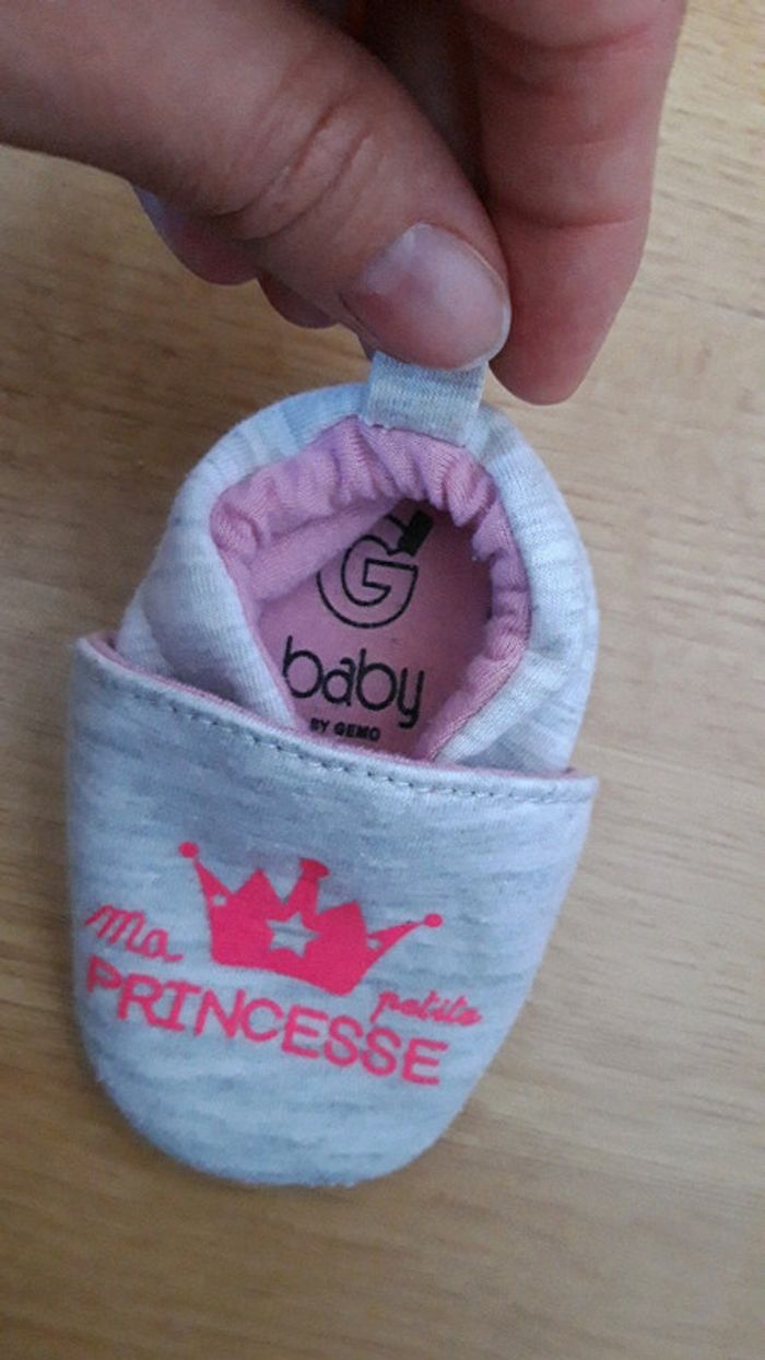 Bonjour, Je vends une paire de chaussure/chausson marque gémo taille 3/6mois en très bon état coloris rose et grise.