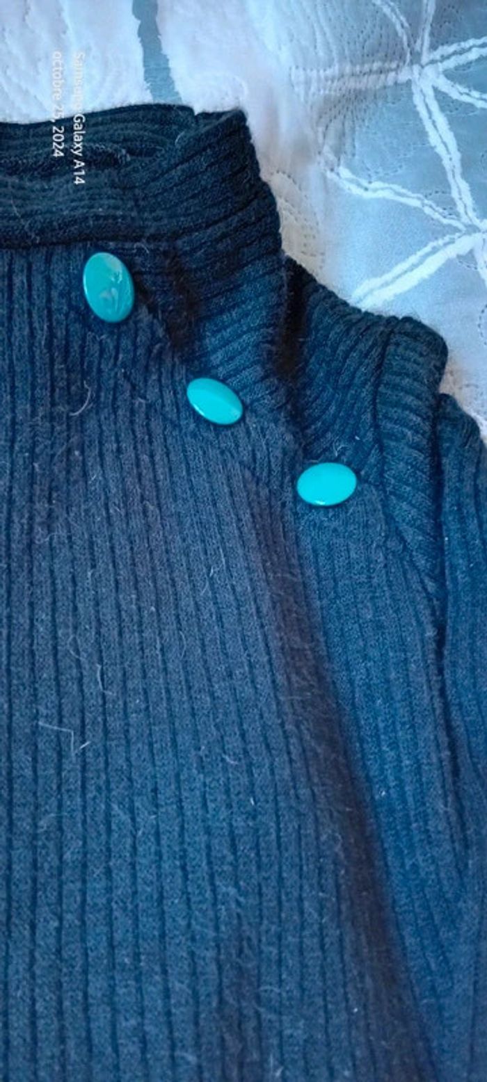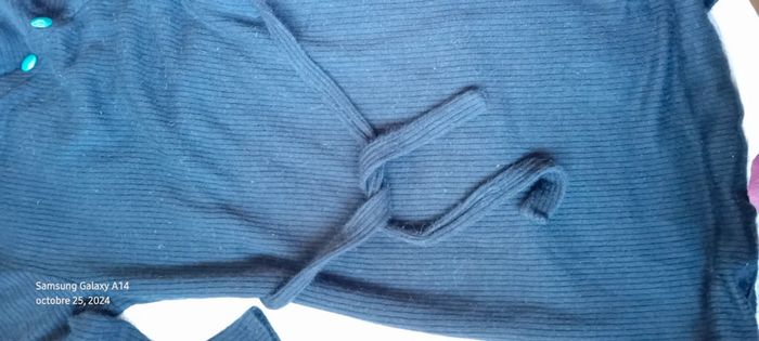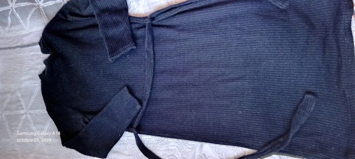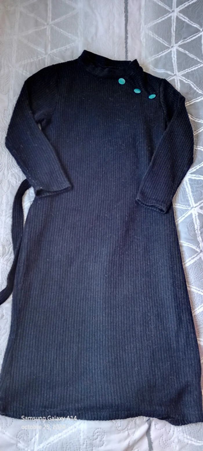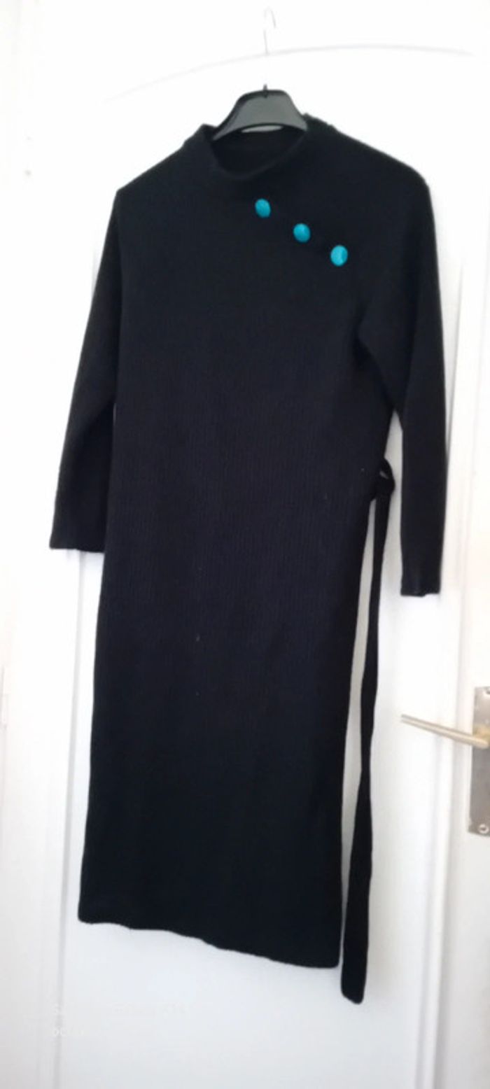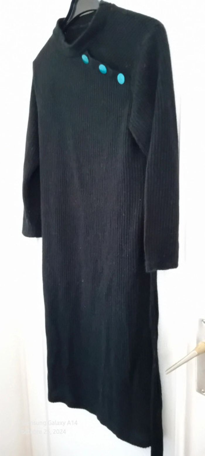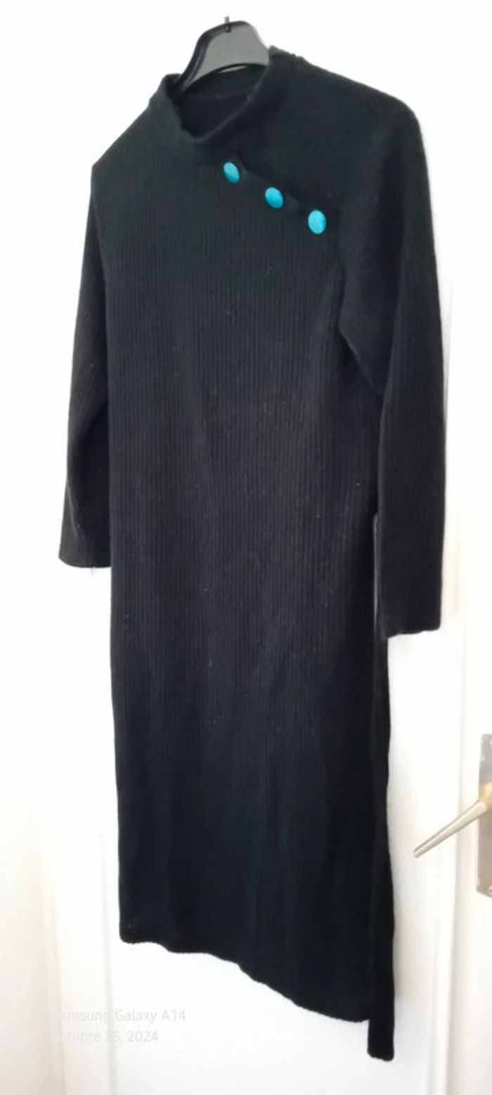 Robe pull en laine acrylique manches longues col montant avec gros boutons bleus sur l épaule ceinture à nouer bien chaude longueur 101 cm largeur aisselles à aisselles 43 largeur épaules 37 cm longueur manches 44 cm juste portée une ou deux fois en très bon état #midole #midolefemme #midolefemme34 #robepullfemme34 #robepulllongue #femme34 #robepullavecceinture #noir