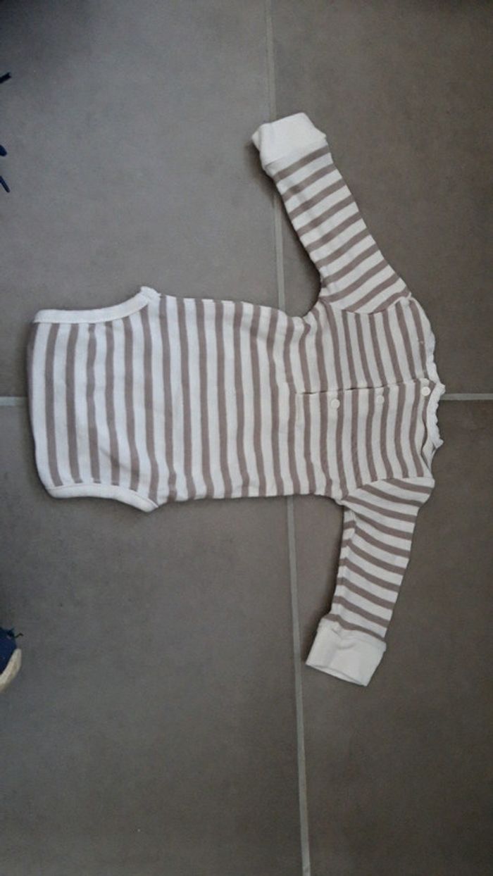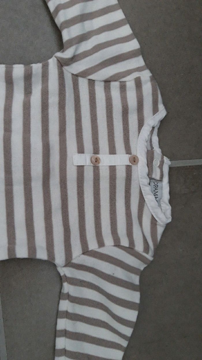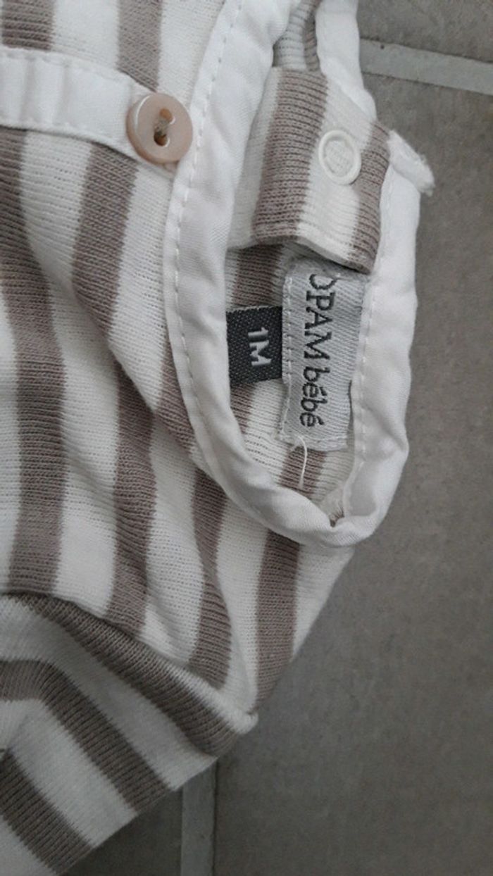 Bonjour, Je vends un body DPAM taille 1 mois. Il est en très bon état car jamais utilisé juste laver. Il est de couleur écru/blanc rayé beige/marron.