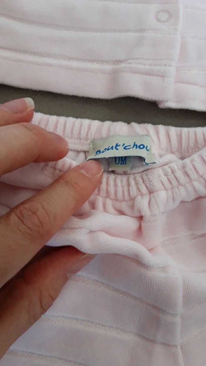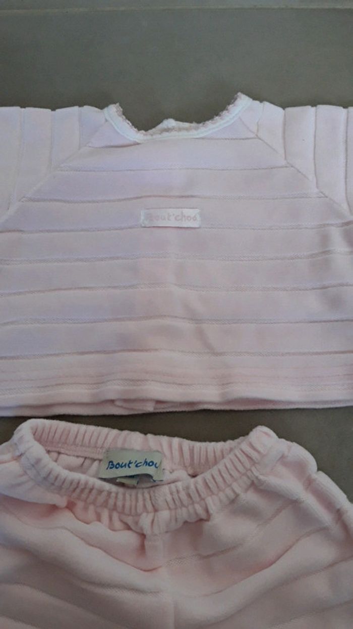 Bonjour, Je vends un ensemble/dors bien/ pyjama de couleur rose marque bout'chou. L'ensemble est en deux deux-pièces et en très bon état.
