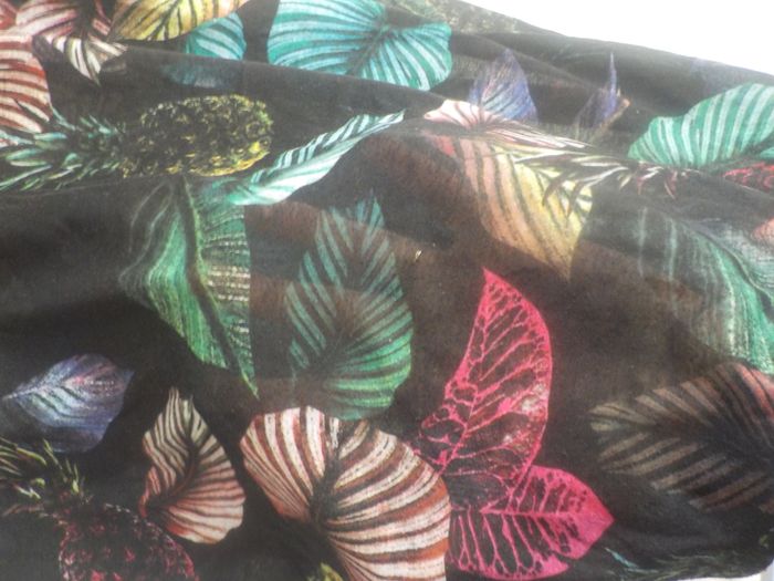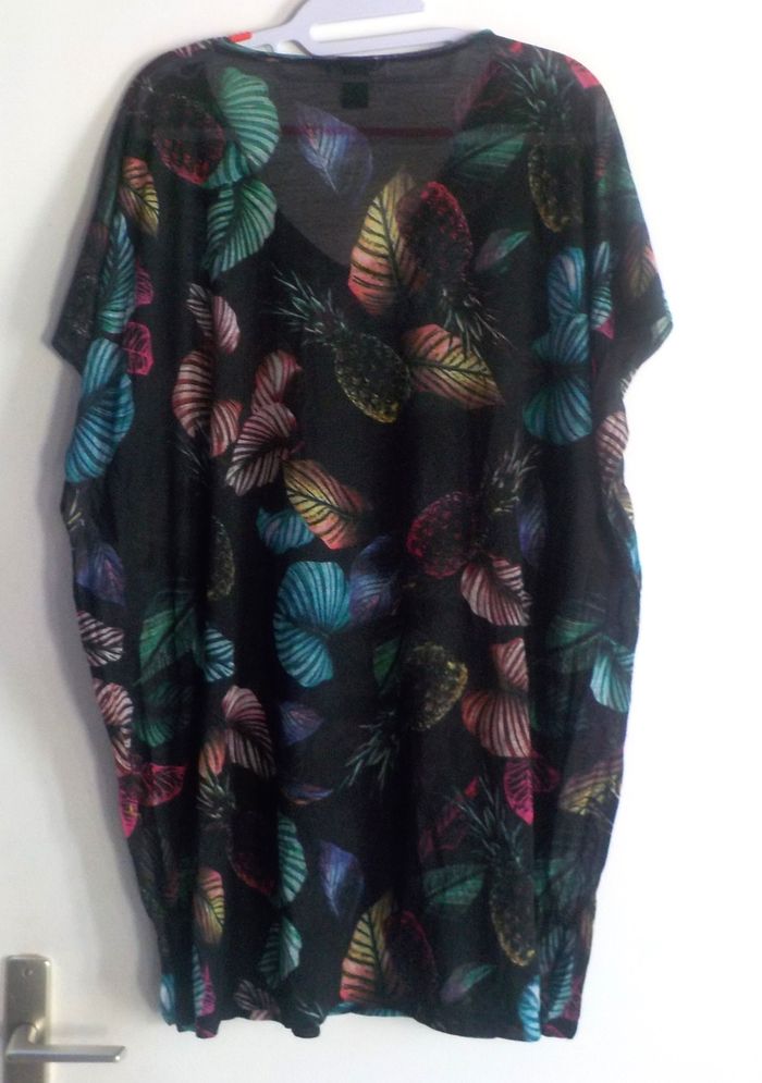 TUNIQUE / TSHIRT H&M Taille S Encolure en V Sans manches Fond noir, dessin de fougères et ananas multicolores Largeur cou : 25 cm Largeur épaules : 72 cm (à cause des épaules "tombantes") Largeur taille : 65 c Longueur épaule/bas de la tunique : 81 cm