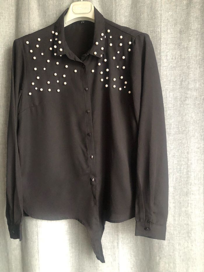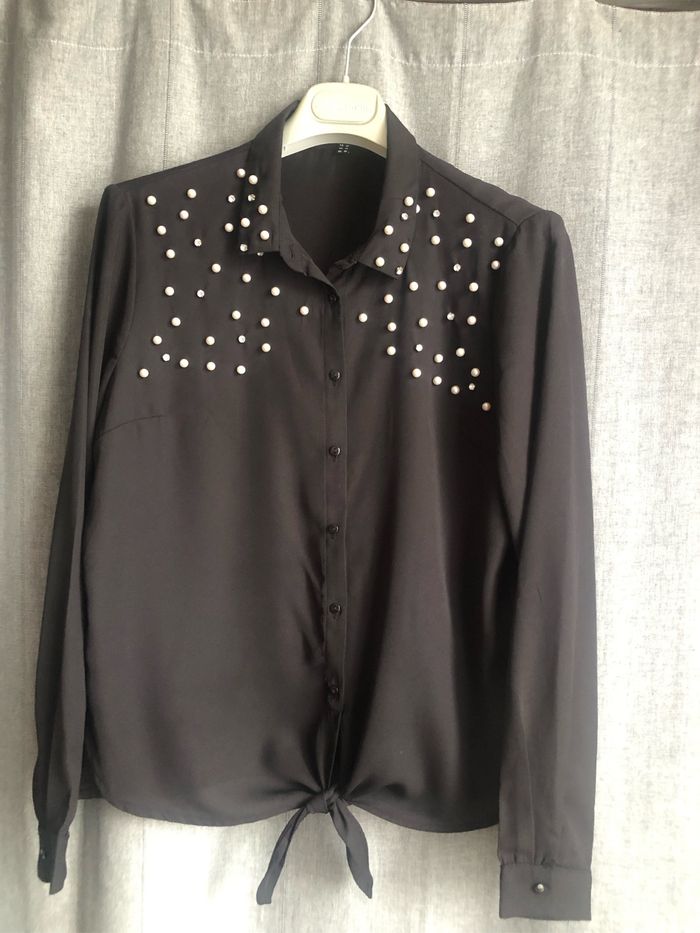 Chemisier voile noir Jennyfer, taille M, avec perles et brillant en haut et noeud dans le bas. Peu porté, très bon état.