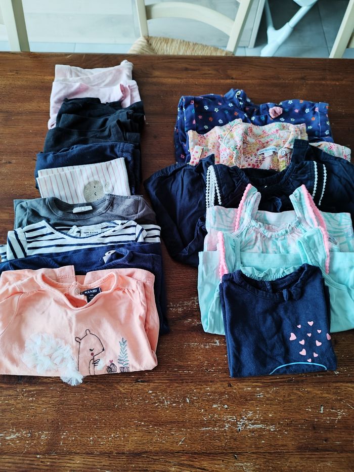 Lot 6 mois fille Bon état général Plusieurs marques 18 pièces 3 hauts manches courtes 3 robe/combinaison (+1 culotte) 4 hauts manches longues 7 leggings
