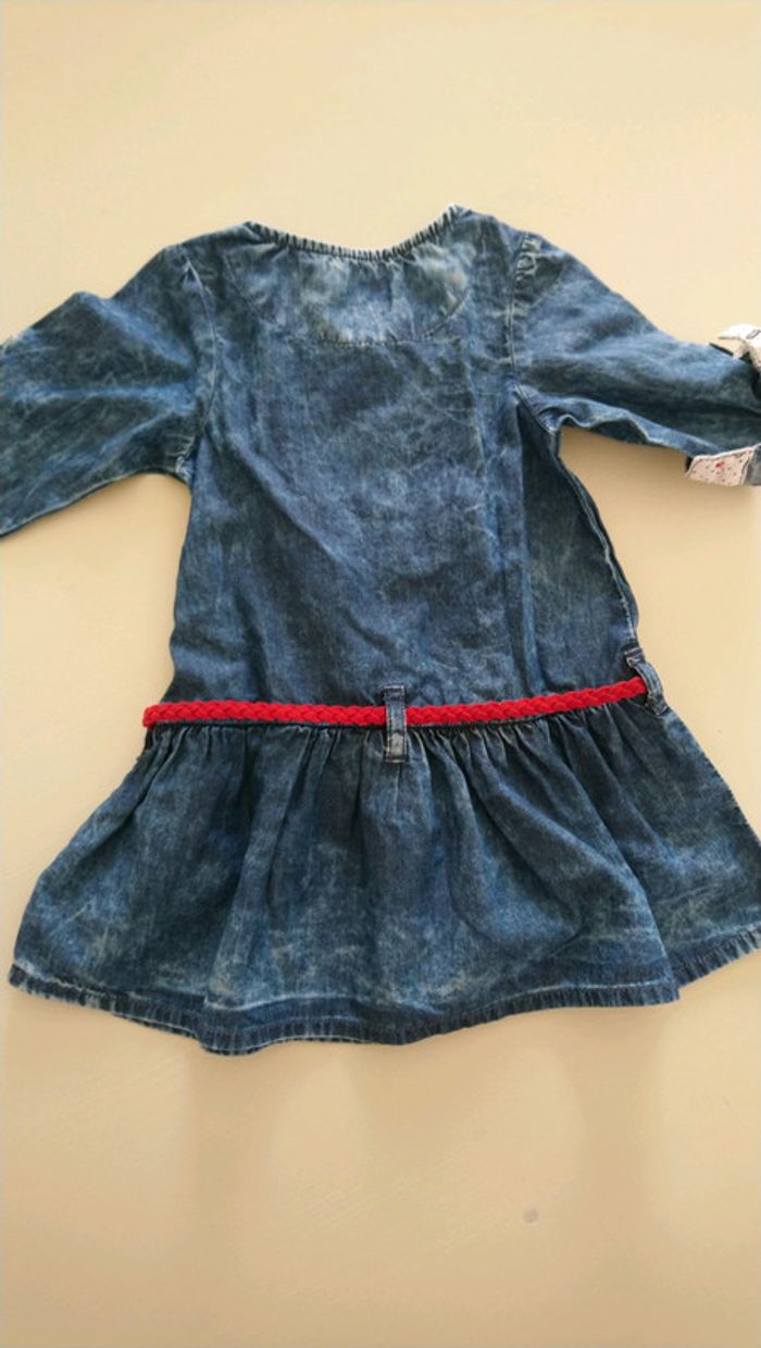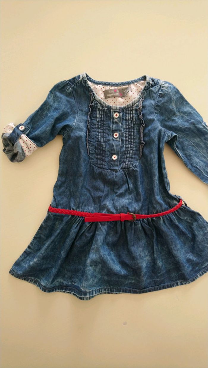 Robe style jean mais fine, manches longues relevables avec boutons, ceinture tressée rouge velours, 12 mois.