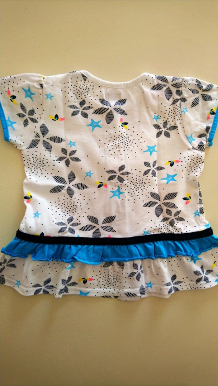 Ensemble: T-shirt manches courtes à motifs (fleurs, étoiles) et pantalon uni bleu marine, 12 mois.