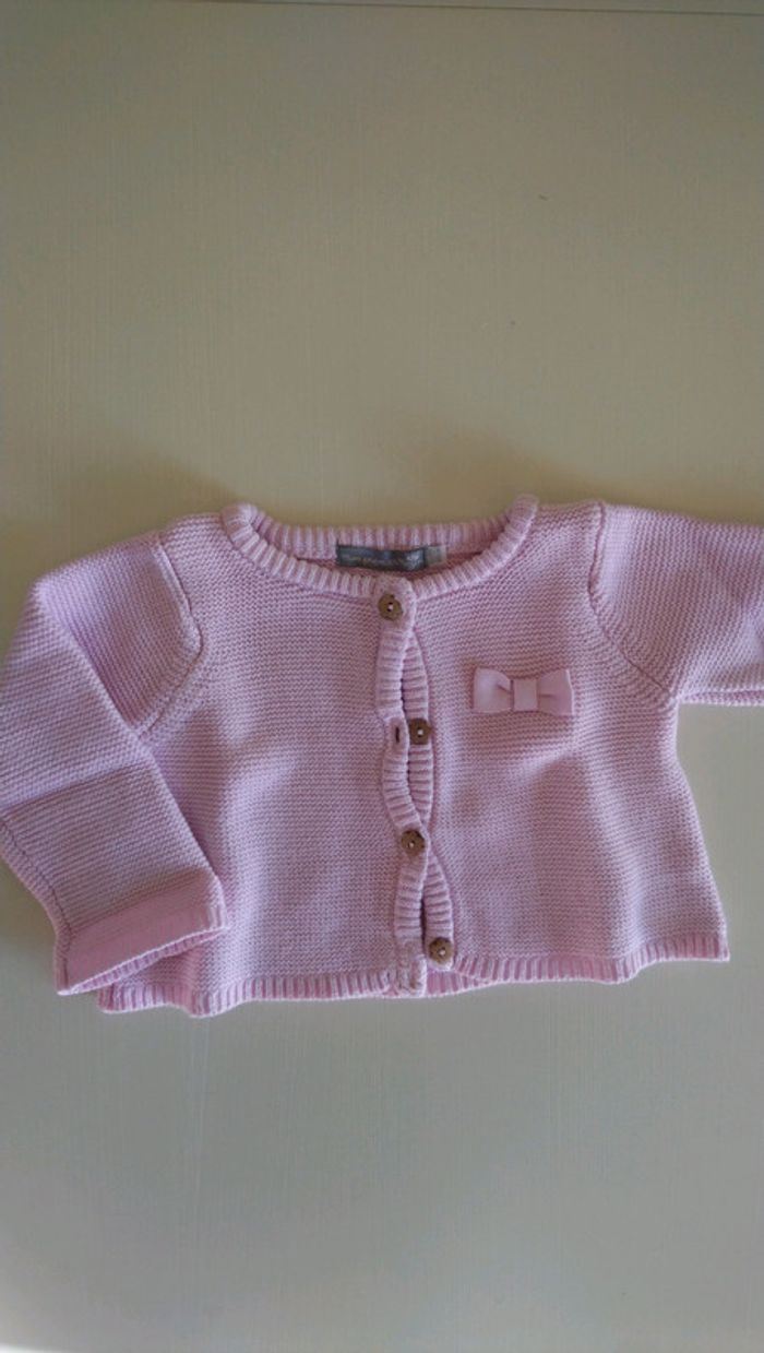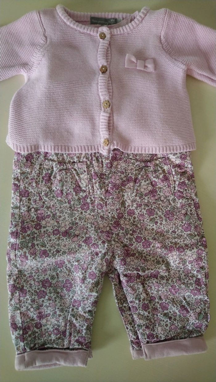 Ensemble: salopette motifs fleurs et lapins, gilet rose et 🧦, Sergent Major, 6 mois. Très peu porté.