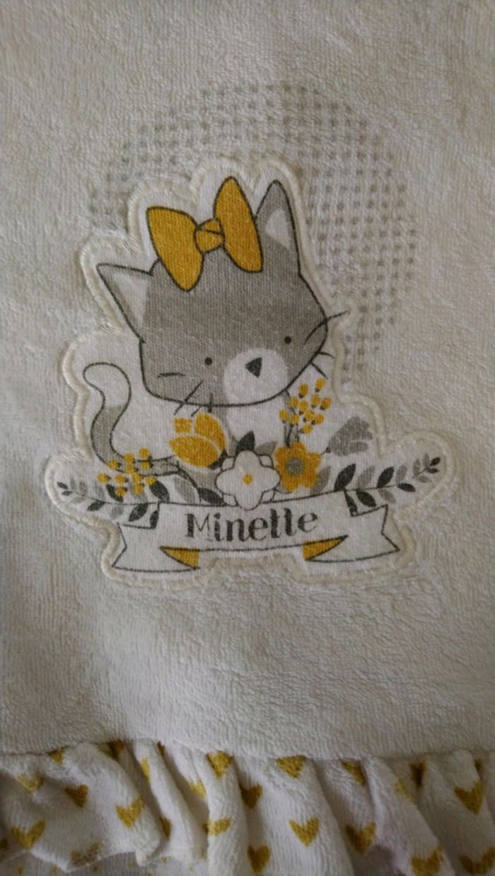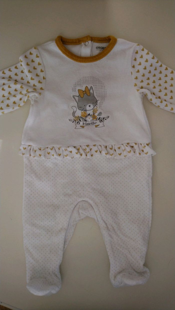 Pyjama 🐱 velours blanc avec cœurs et pois moutarde, 6 mois.