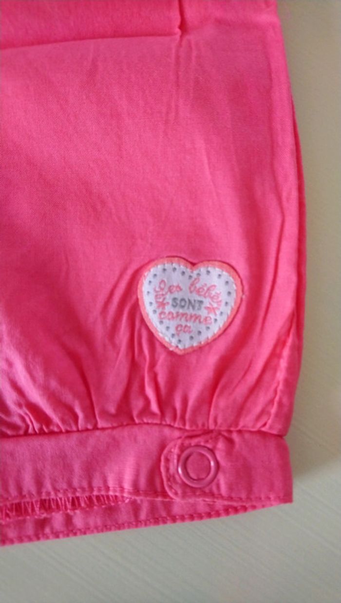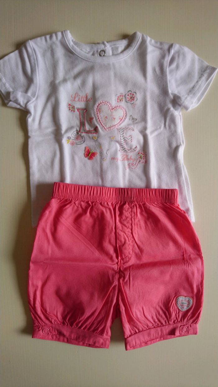 Ensemble Absorba: T-shirt manches courtes blanc "Little LOVE my baby" et short fuchsia, neuf jamais porté, 3 mois.