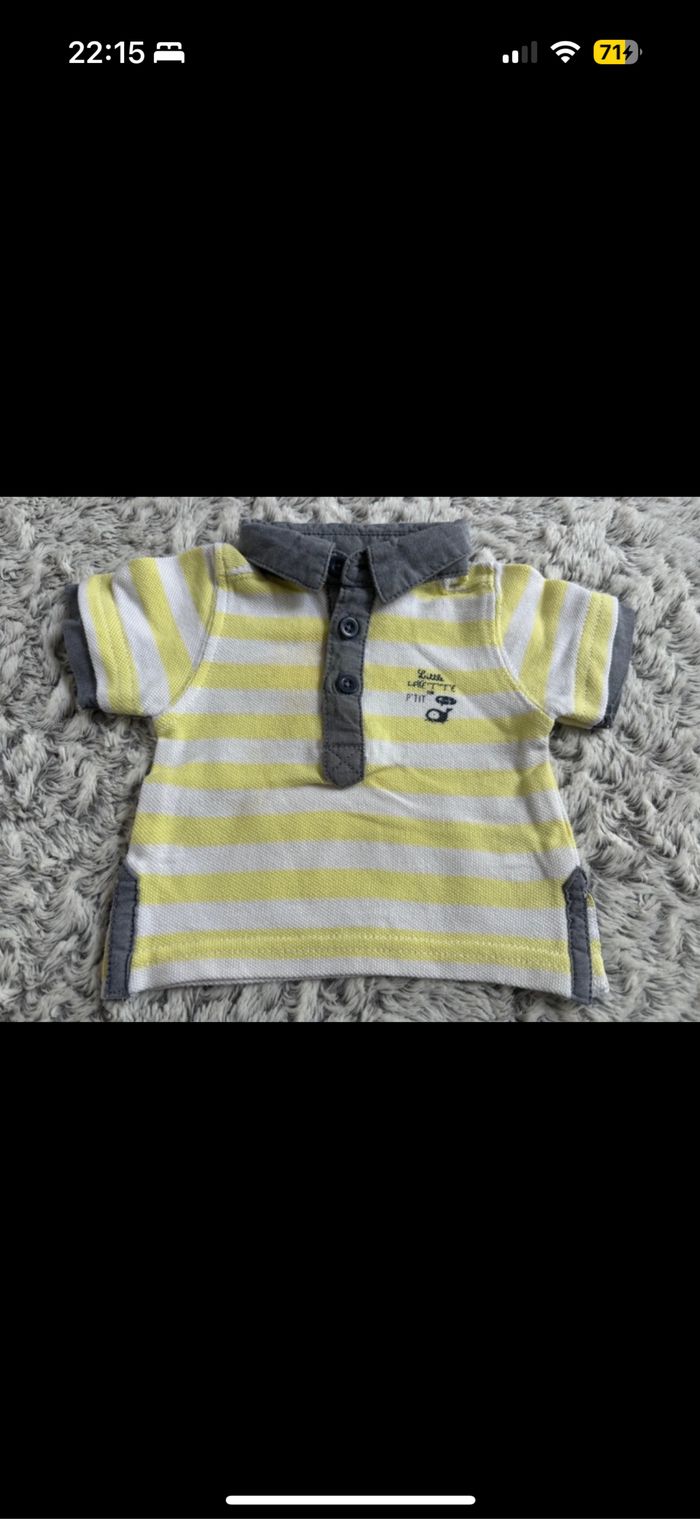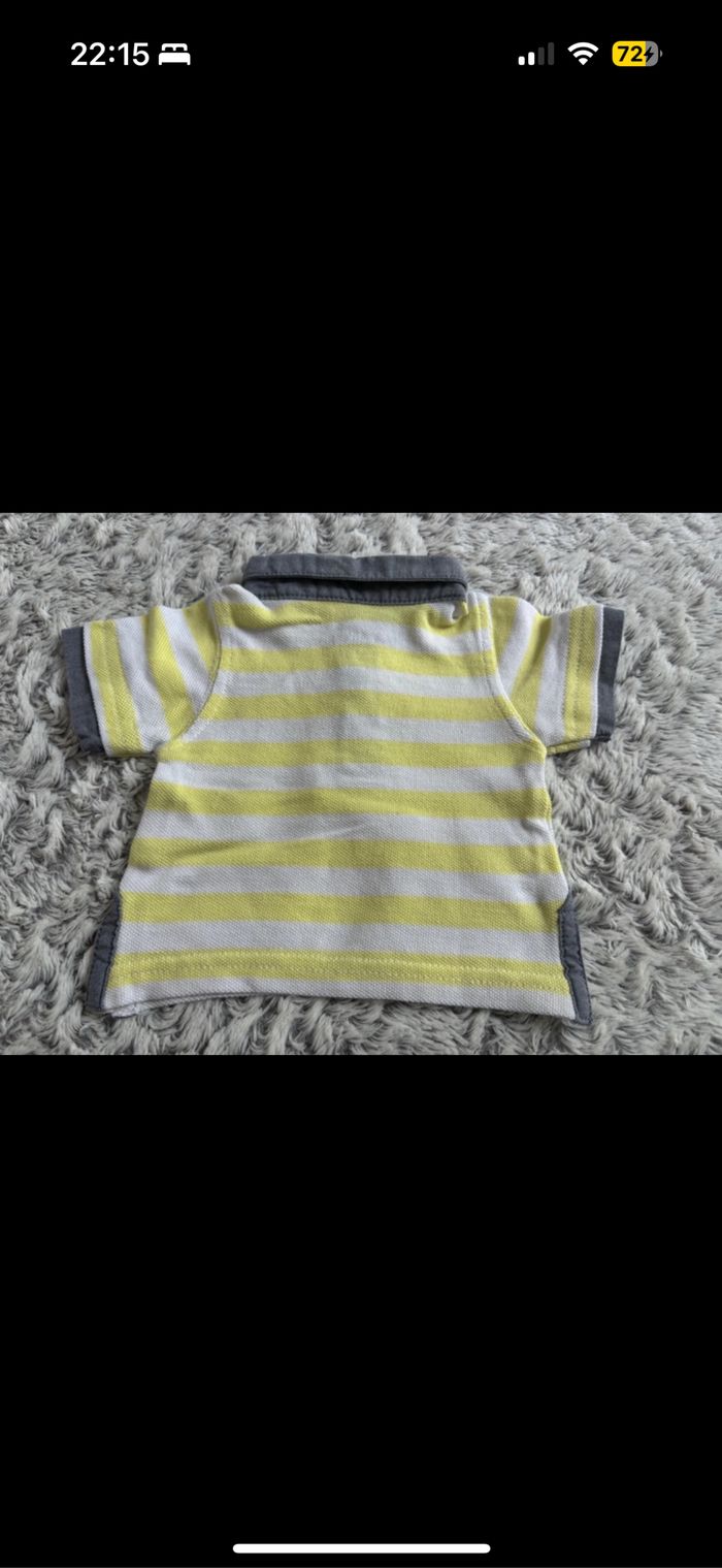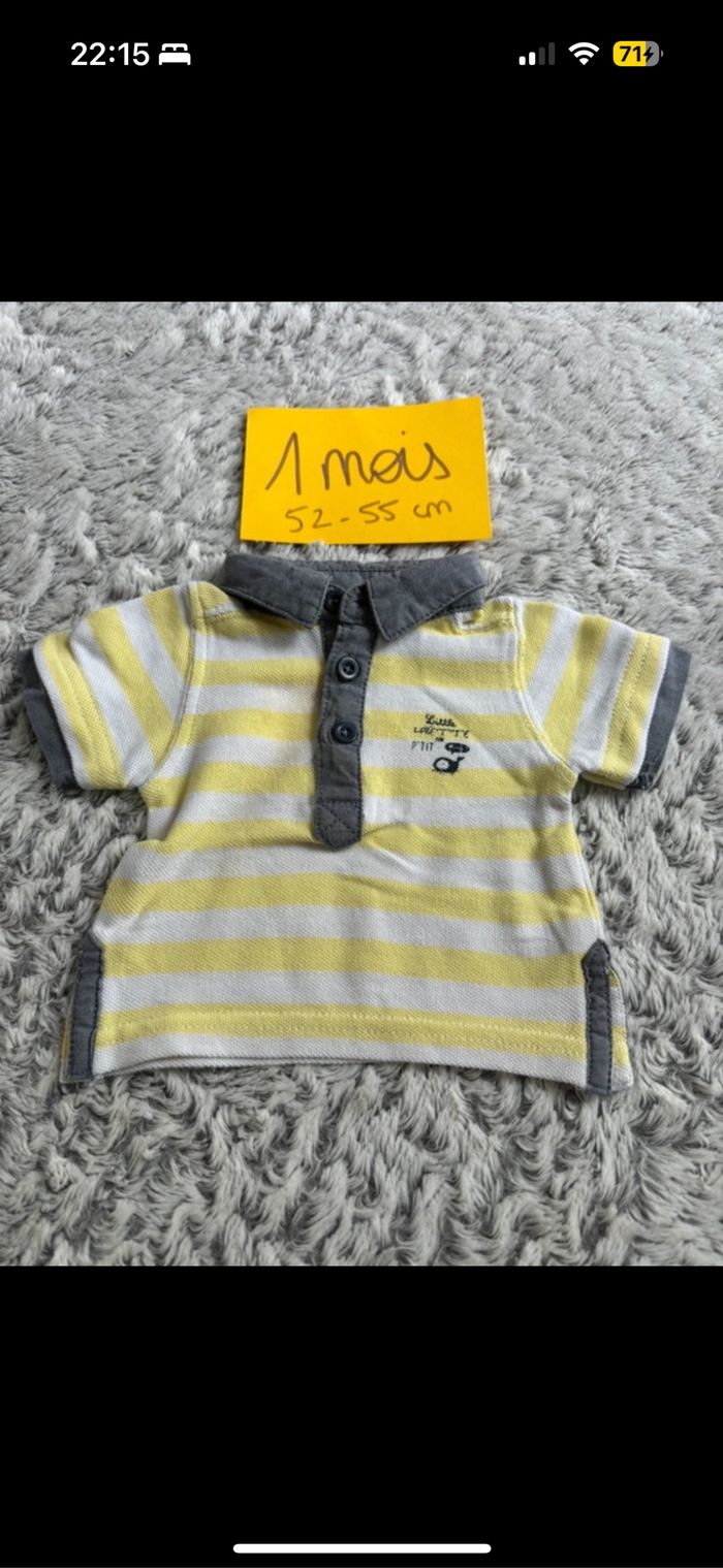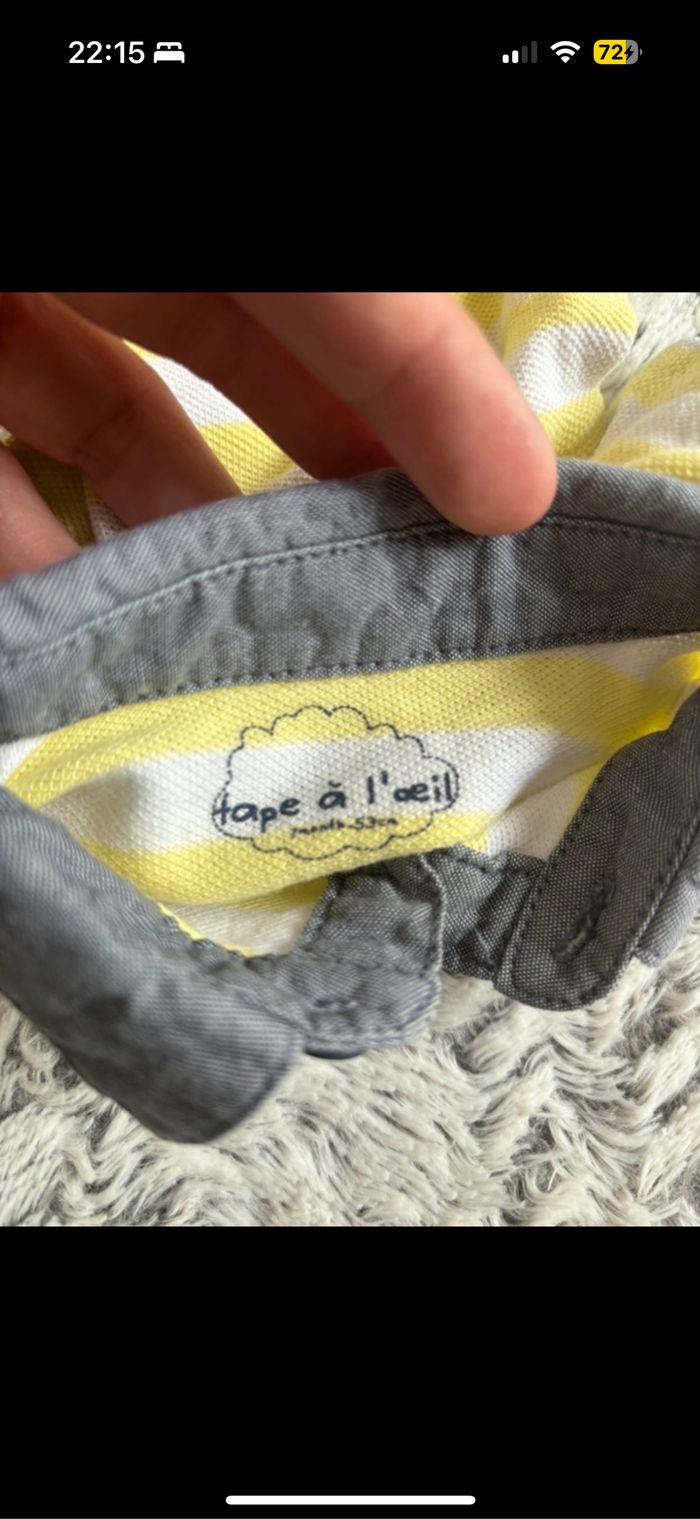 Polo Tape à l’Oeil manches courtes. Taille : 1 mois, 53 cm. Couleurs : jaune et blanc, effet jean sur le col et les manches.
