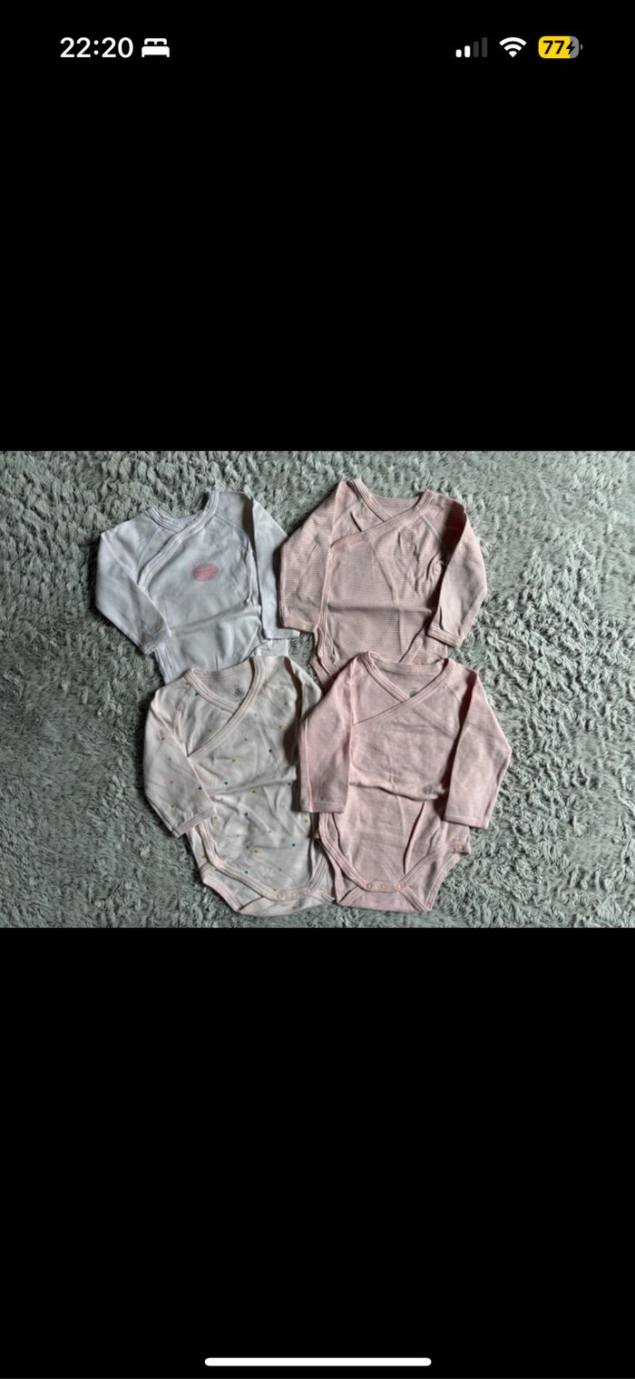 Lot de 4 bodies Petit Bateau, modèle kimono, manches longues, taille 6 mois 67 cm.