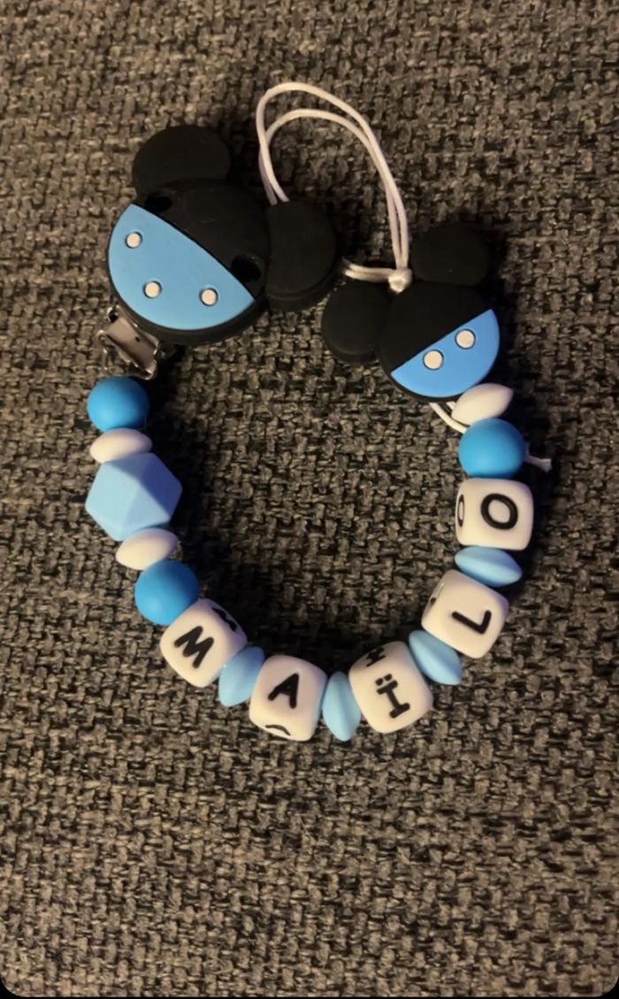 Attache tétine personnalisé en silicone ou en bois au souhait de l’acheteur . Personnalisable au choix de l’acheteur que ce soit la couleur comme le prénom ou le thème . Le fil est doublé pour plus de sécurité tout le long de l’attache tétine. N’hésitez pas à me demander et regarder mon dressing. Une photo vous sera envoyée avant l’expédition pour vous ayez un aperçu du rendu. Tous les produits sont réalisés avec du materiel spécial conçu aux bébés , enfants.