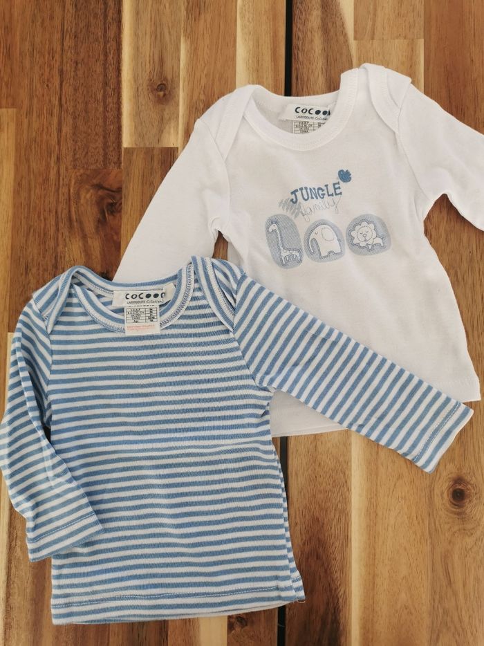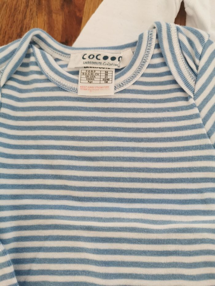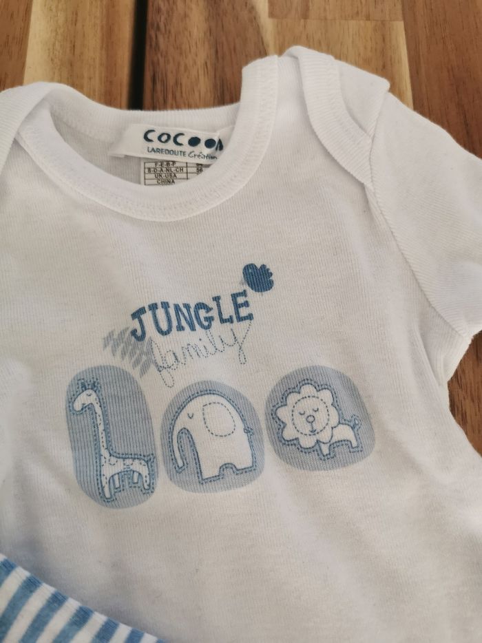 Comme neufs Taille 1 mois / 54 cms 1 rayé bleu et blanc 1 blanc motifs jungle family