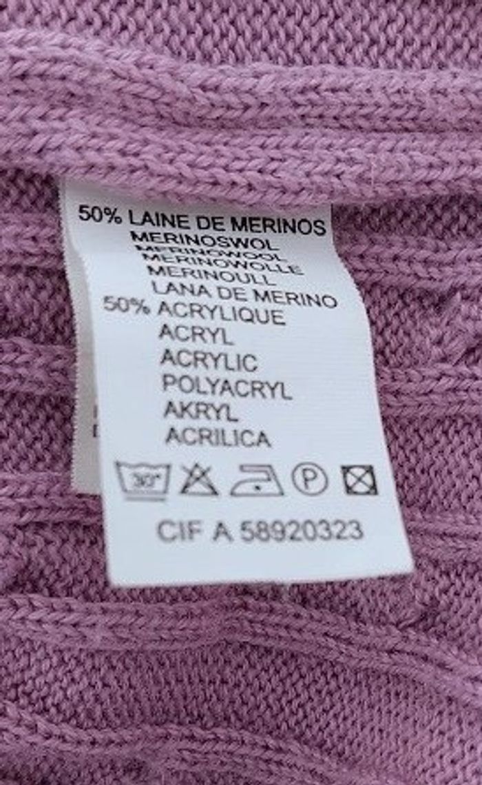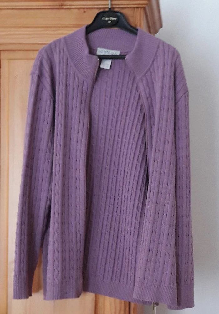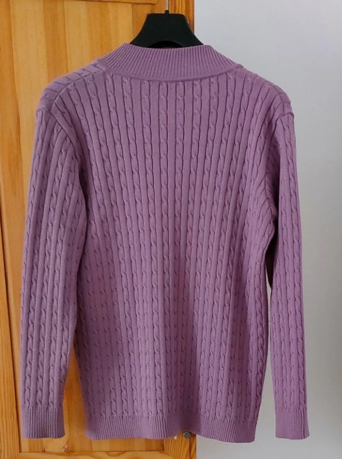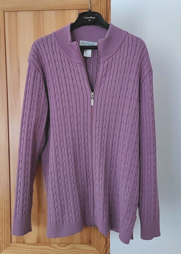 Cardigan torsadé coloris violine , entièrement zippé (zip double curseur) col montant . 50 % laine mérinos 50% acrylique Dimensions: Longueur environ 70 cm ,épaule à épaule 45 cm Fentes côtés : 8 cm Très bon état, aucun défaut