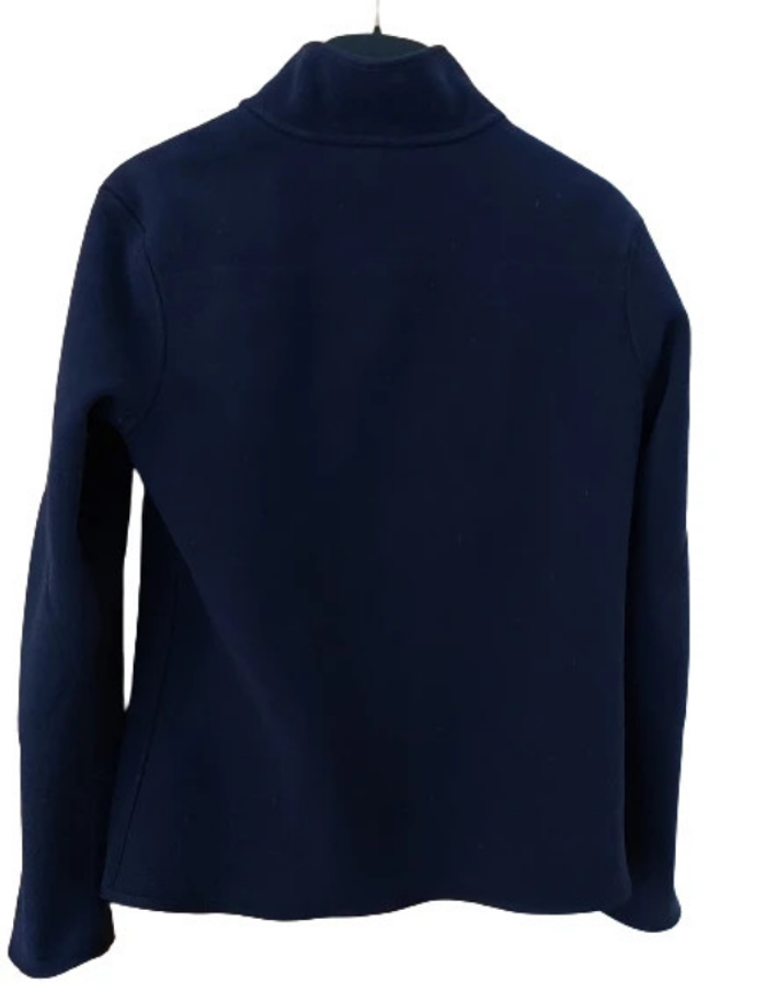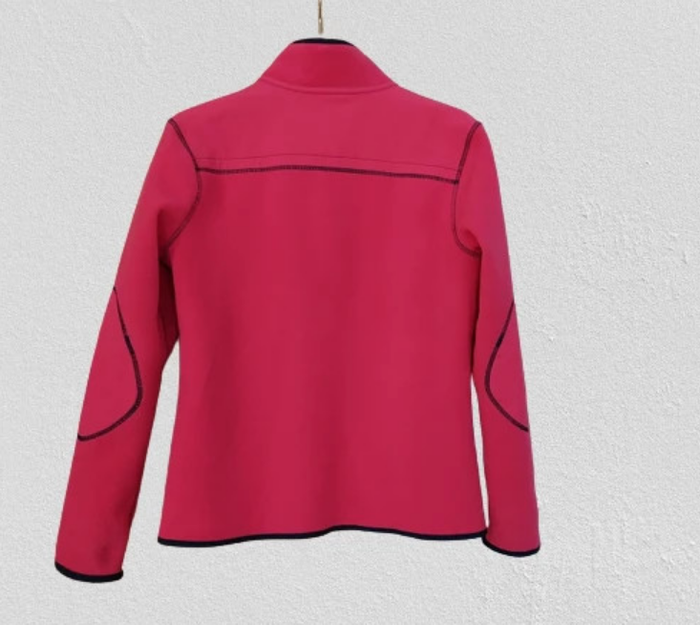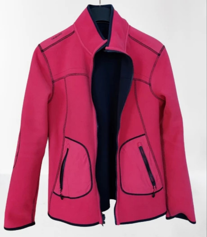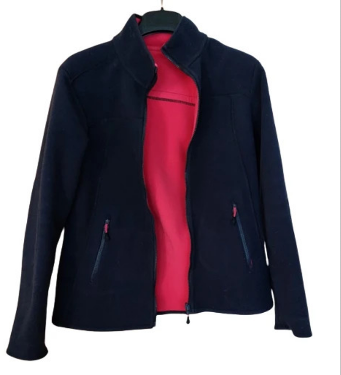 Veste style sportswear réversible une face bleu marine , une face fuschia , style casual mais non dénué d'un certain chic . 2 poches zippées , étiquettes dans une des poches. Longueur environ 61 cm , épaule à épaule 40 cm . Comme neuve, portée 2 fois. Oxylane pour Décathlon