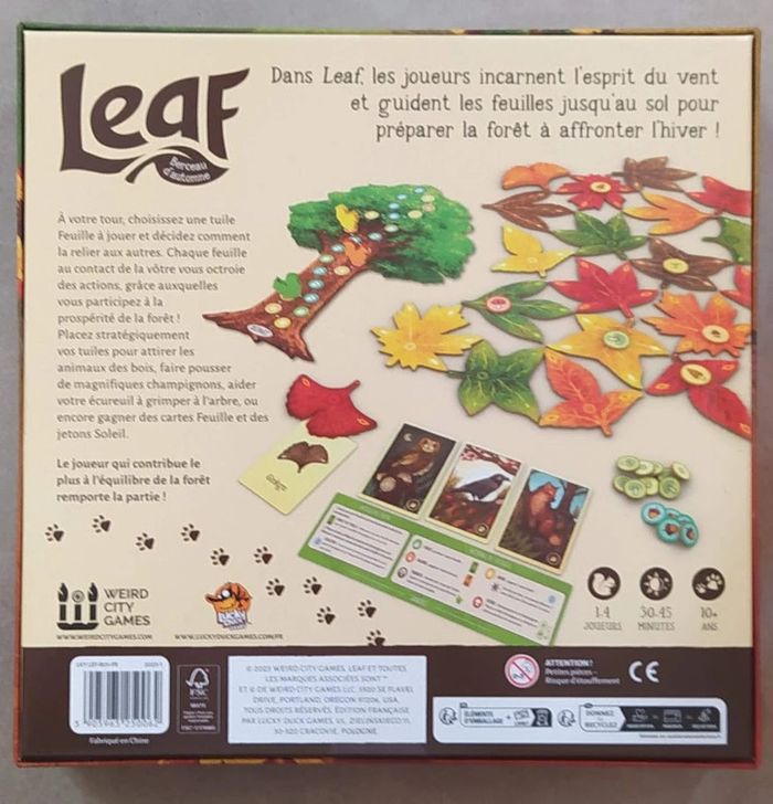 Ludipresta : Vente professionnelle - Jeu de société sous emballage - Prix Ferme Français à partir de 8 ans 30mn à 1h 1 à 4 joueur(s) Mécanisme(s) : Collection, Tuiles, Placement Incarnez l’esprit du vent et guidez les feuilles jusqu’au sol pour préparer la forêt à affronter l’hiver ! À votre tour, choisissez une tuile Feuille à jouer et décidez comment la relier aux autres. Chaque feuille au contact de la vôtre vous octroie des actions, grâce auxquelles vous participez à la prospérité de la forêt ! Placez stratégiquement vos tuiles pour attirer les animaux des bois, faire pousser de magnifiques champignons, aider votre écureuil à grimper à l’arbre, ou encore gagner des cartes Feuille et des jetons Soleil. Dans Leaf, le joueur qui contribue le plus à l’équilibre de la forêt remporte la partie ! Vidéo : https://www.youtube.com/watch?v=yViTWEbou7o