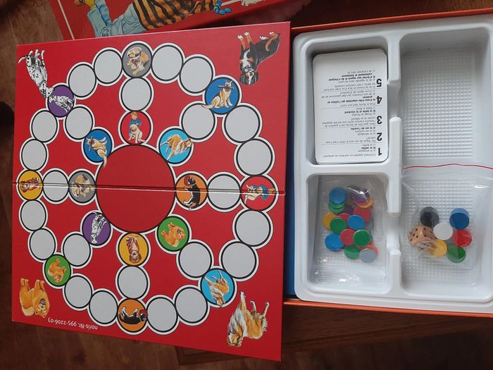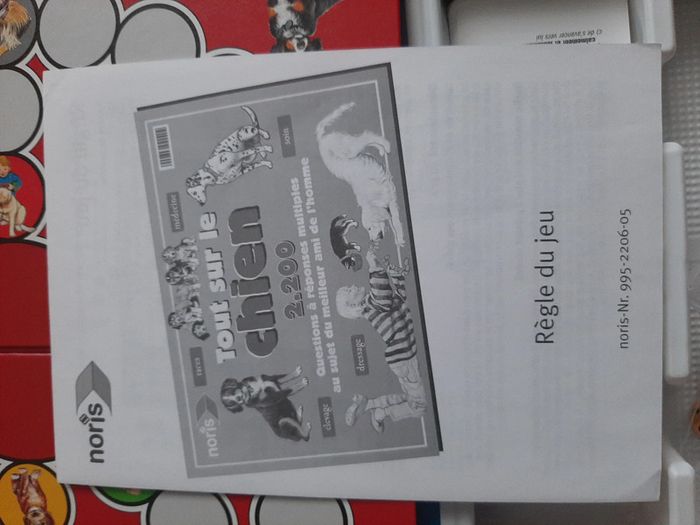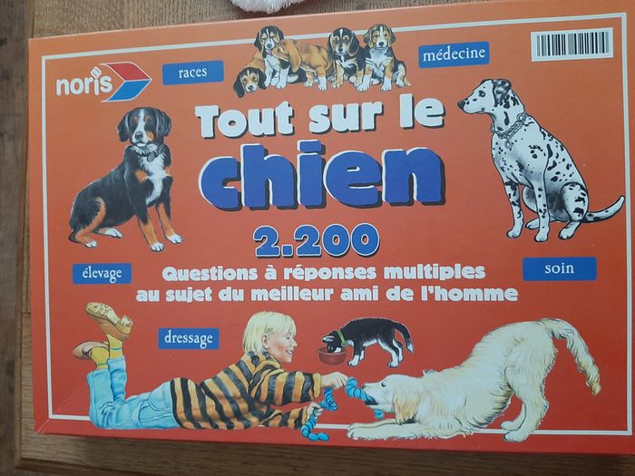 Jeu quizz avec 2200 questions avec des réponses multiples sur le meilleur ami de l'homme, à partir de 7 ans, 2 à 6 joueurs, comprend plateau de jeu, 6 plots en bois, des pions, un dé, 55 cartes, notice de jeu, neuf car jamais utilisé mais boite un peu abimée