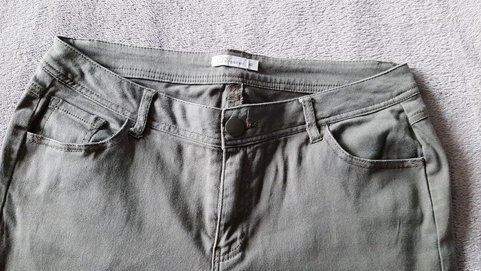 jean droit, couleur kaki, fermé par zip + bouton, 2 poches bassin + 2 fesses, taille 40, marque Tout Simplement