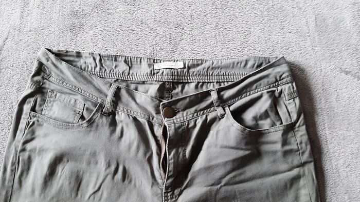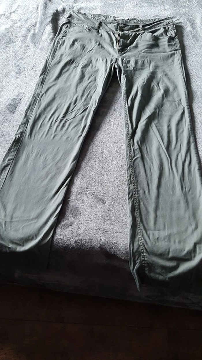 pantalon fin légèrement elastiss, couleur kaki, 98% coton +2% elastan, fermé par zip + bouton, 2 poches bassin + 2 fesses, taille 40, marque Tout Simplement