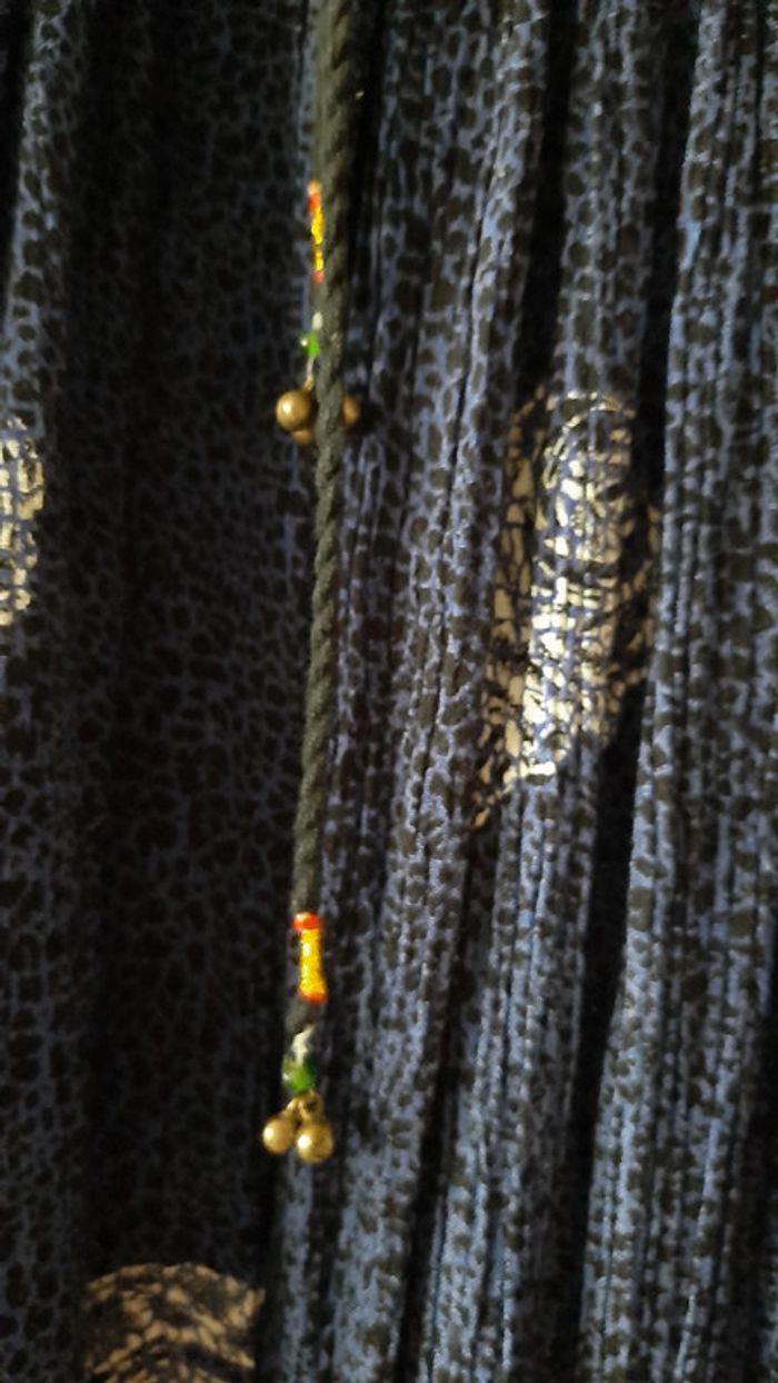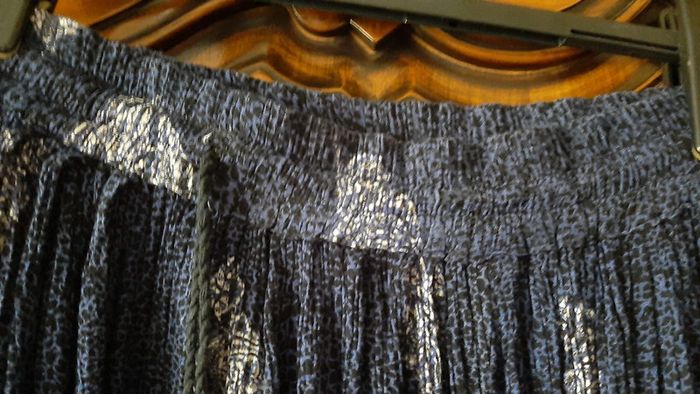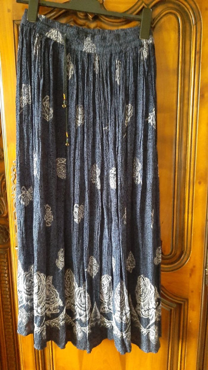 jupe longue (bas de la cheville), fluide, elastique à la taille + cordon avec perles, plissé fin, 100% rayon, couleur marine moucheté noir + dessins blancs, taille 42/44