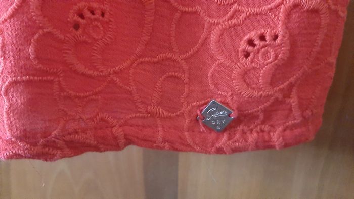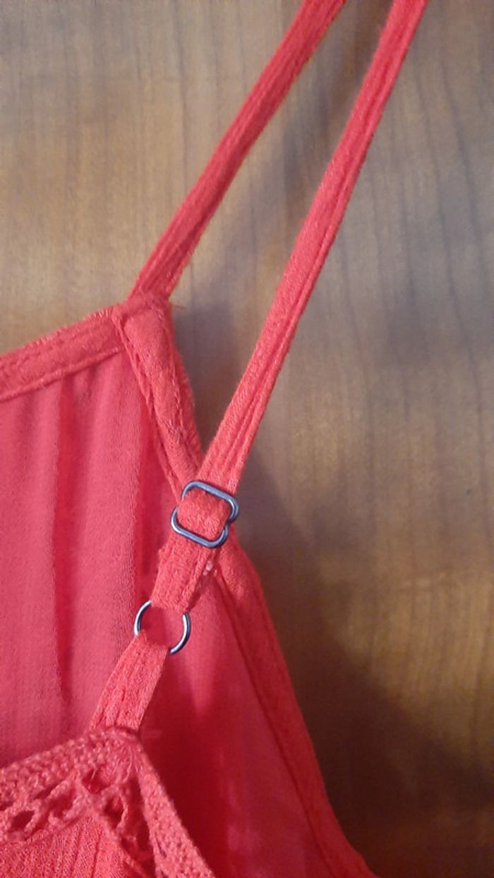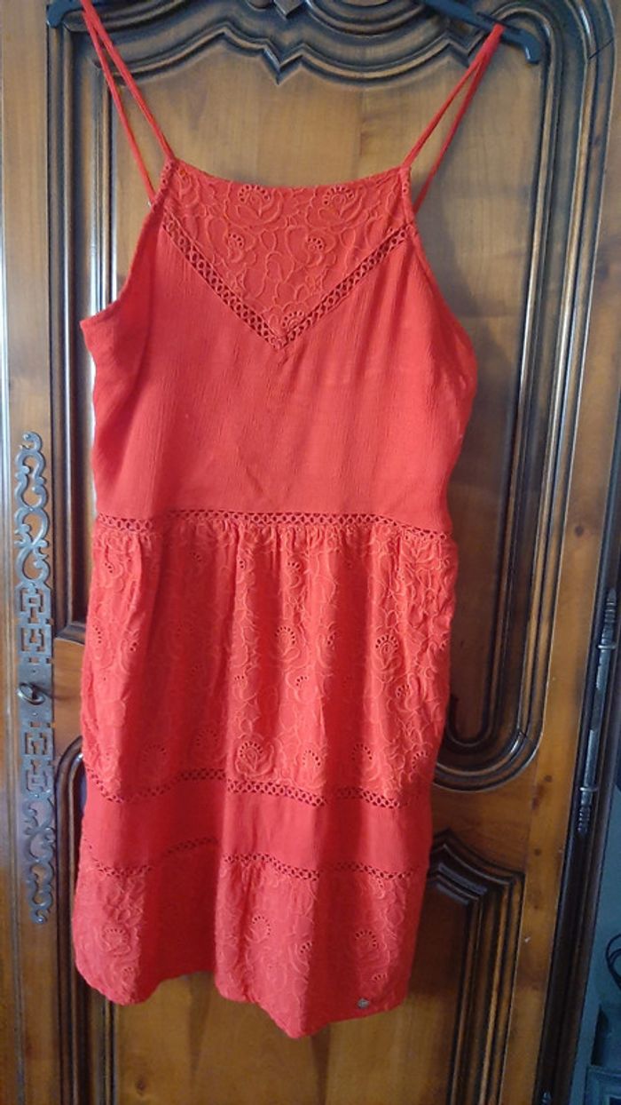 Robe courte ajourée (dessus genou) à bretelles réglables, doublure nylon, broderie, zip coté gauche, 2 poches à la taille, couleur rouge (ne pas se fier à la photo), taille L, marque Superdry, jamais portée