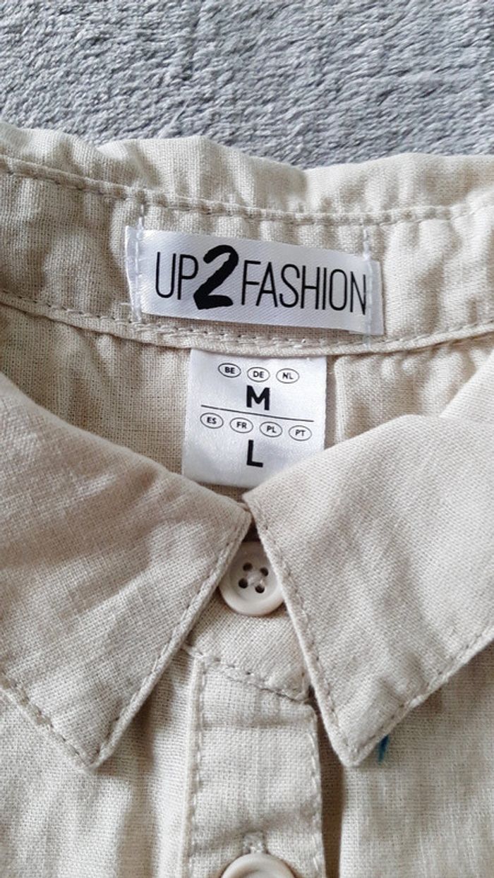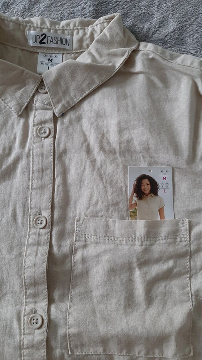 chemisier blouse 50% lin, 50% coton, tout boutonné, poche poitrine, manche courtes, couleur ficelle, taille L, marque UP2FASCHION, neuf avec etiquette