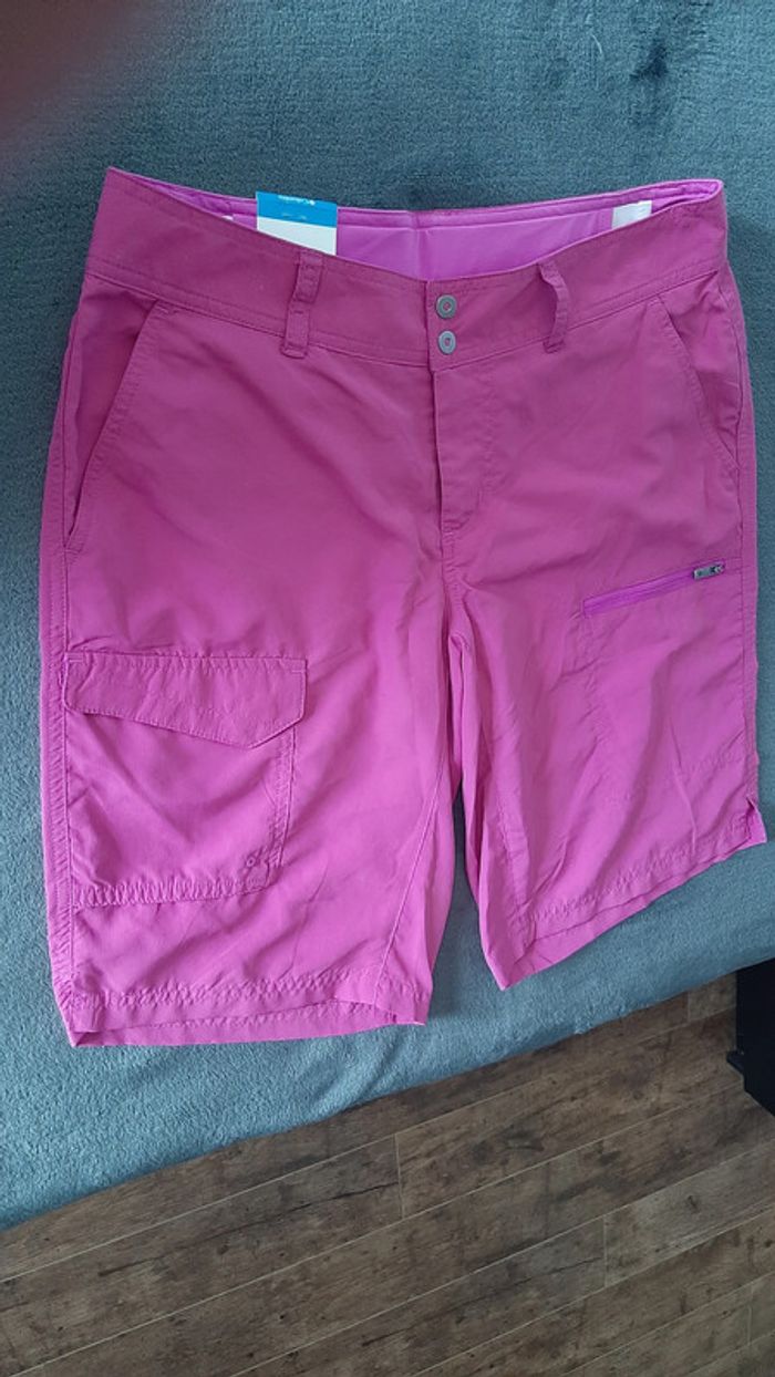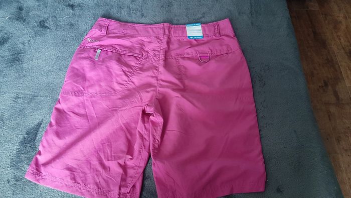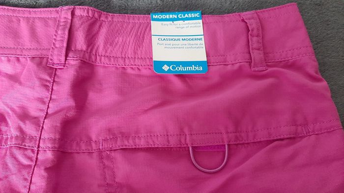 short long fermé par 2 pressions + zip, elastique réglable par 2 boutons à la taille, 2 poches bassin + 1 poche cuisse fermée par 2 scratch + 1 sur la fesse avec zip + 1 sur la fesse avec scratch, couleur lilas rose, taille 38, marque Columbia,