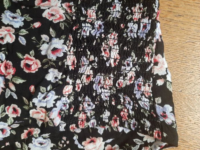 joli petit top à fleurs, fond noir, smocks de chaque coté, bretelles doubles, 100% viscose, taille 44, marque H&M
