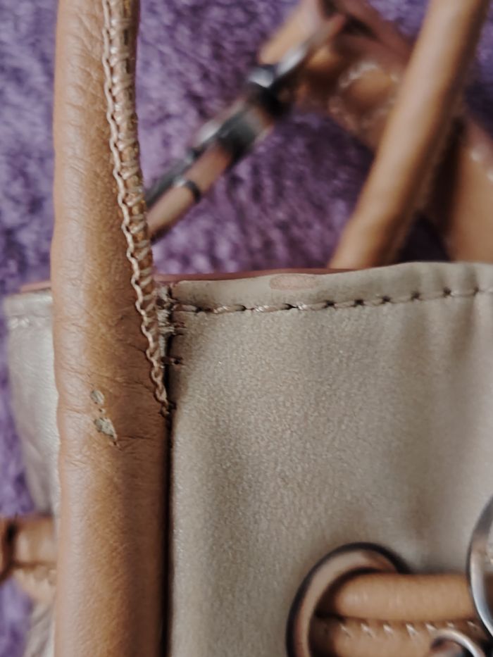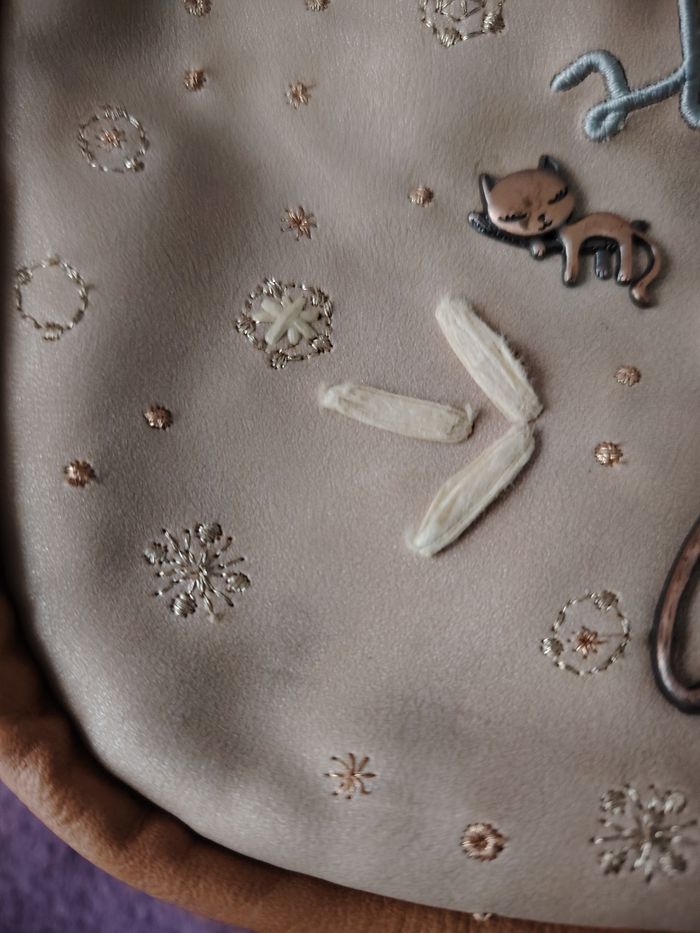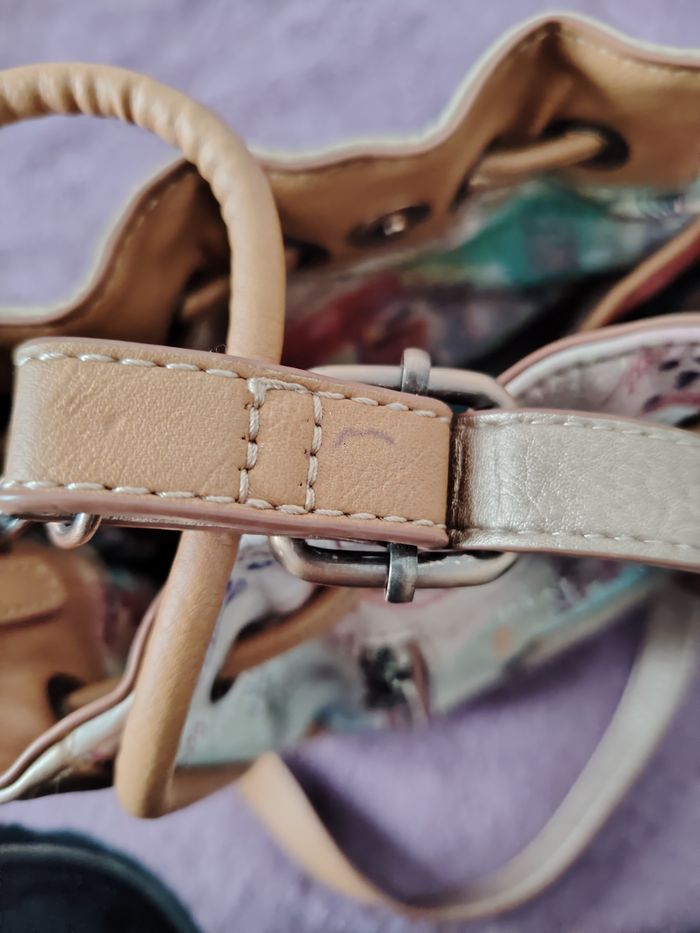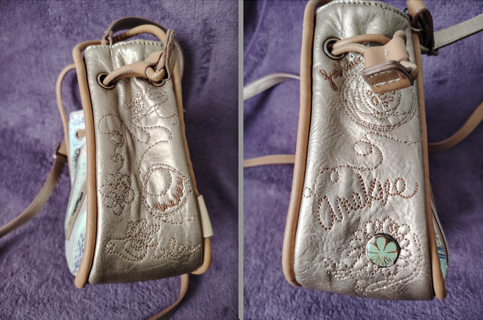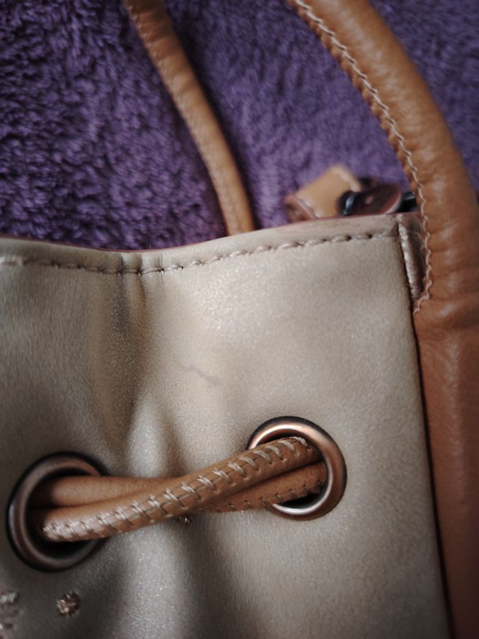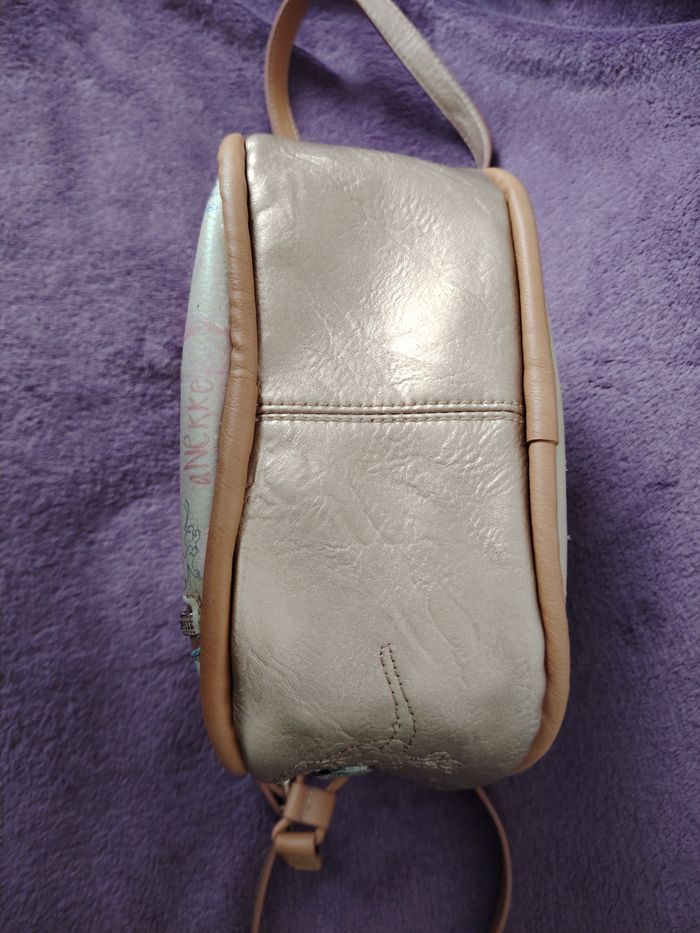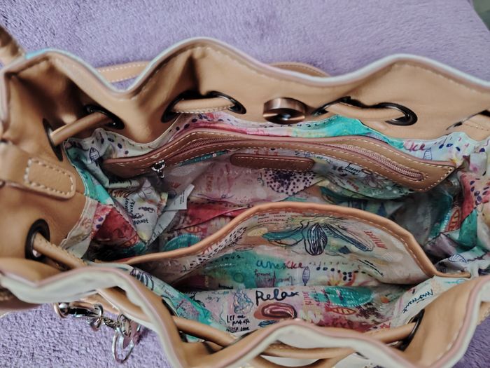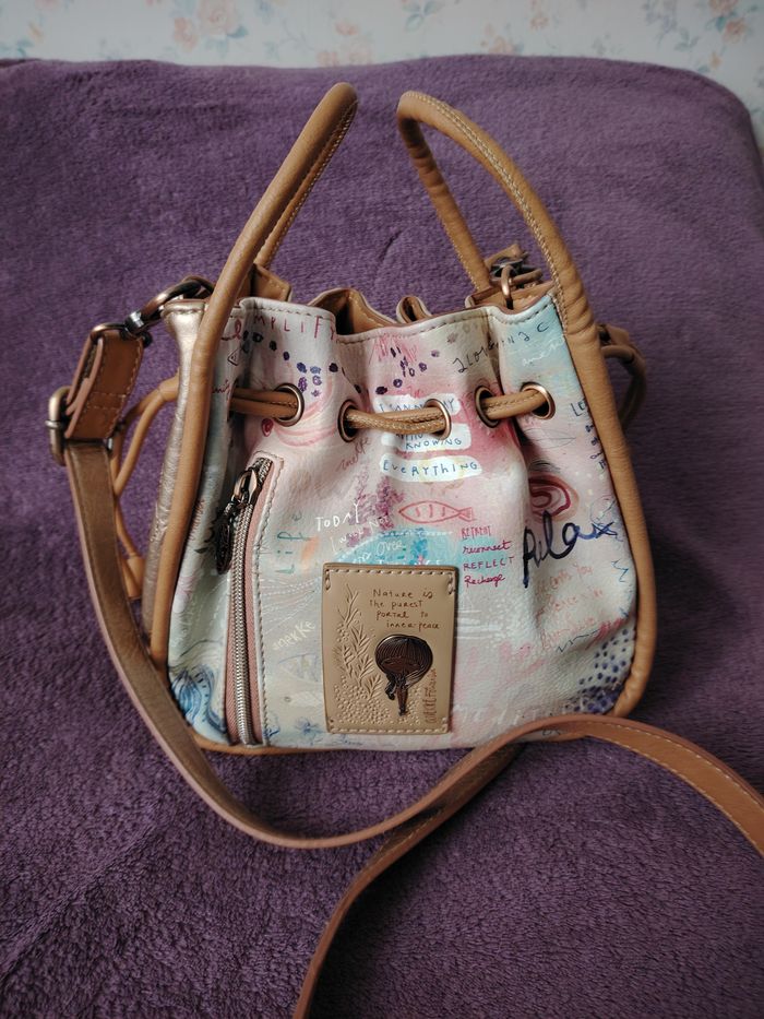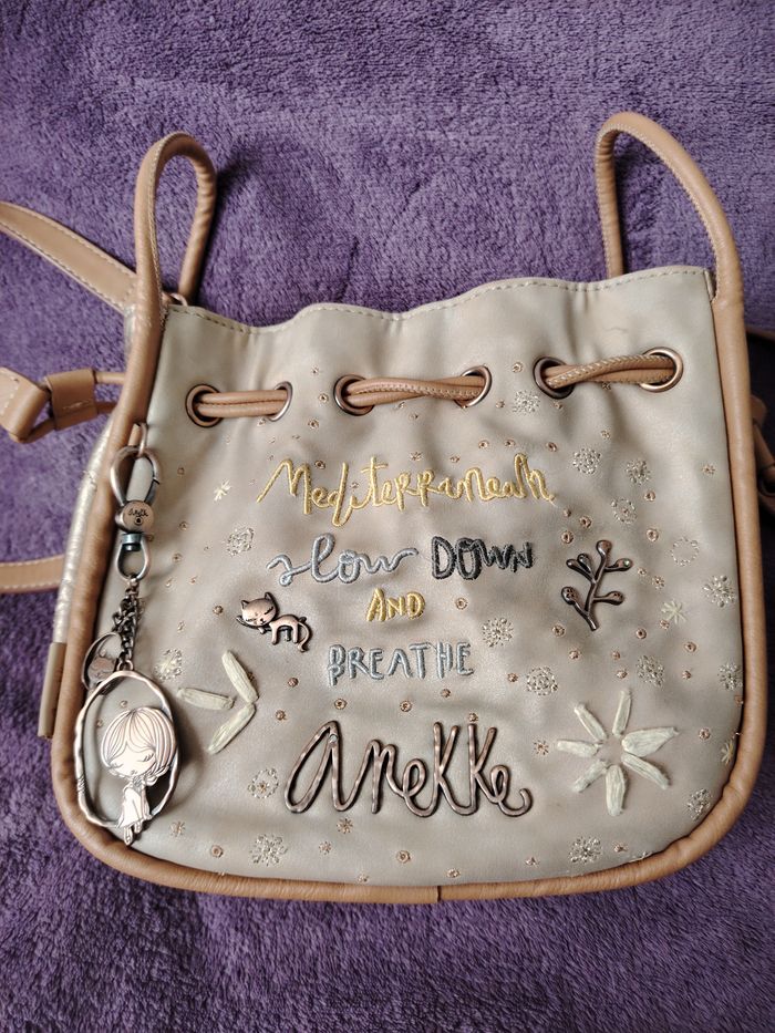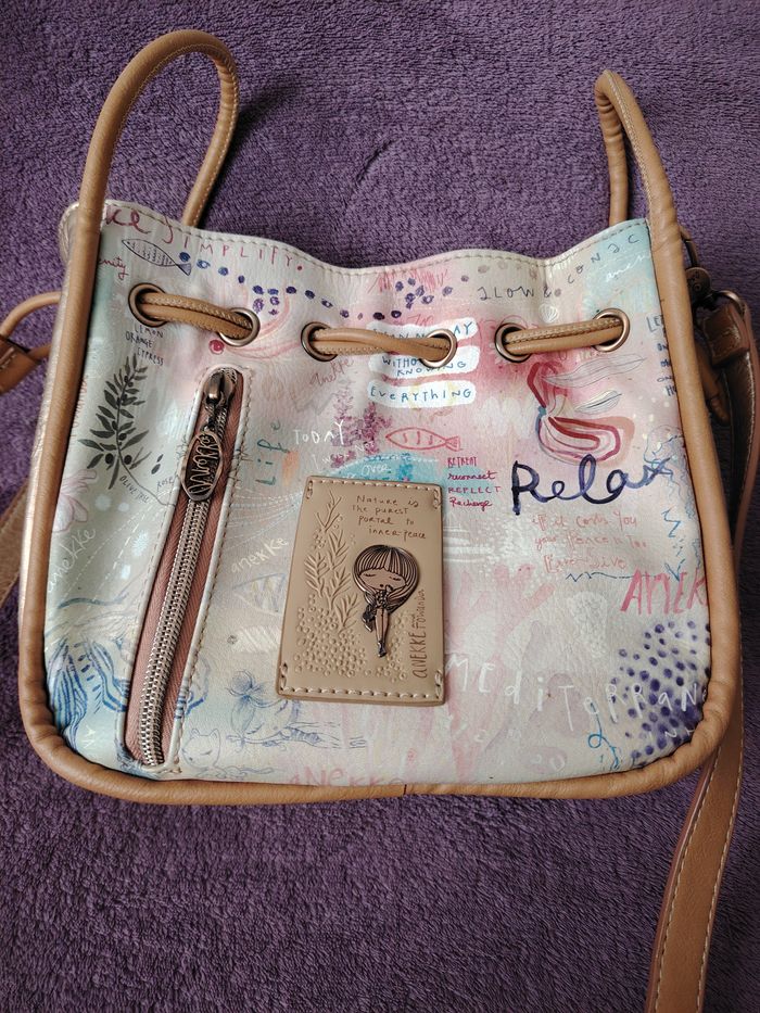 Sac bandoulière de la marque Anekke et de la collection Slow Life. Dimensions : 23 cm de longueur, 21 cm de hauteur et 9 cm de profondeur. Il se ferme par une pression aimantée et/ou un cordon qui se resserre. Il a 1 poche extérieure et 2 intérieures. La bandoulière mesure 132 cm au maximum. Je l'ai mis en bon état car il a des petits défauts : 2 petites traces de stylo (une sur la bandoulière et une sur le haut du sac), la matière est très légèrement râpée sur la partie supérieure et il y a 2 traces grises ; le tout est montré sur les 4 dernières photos.