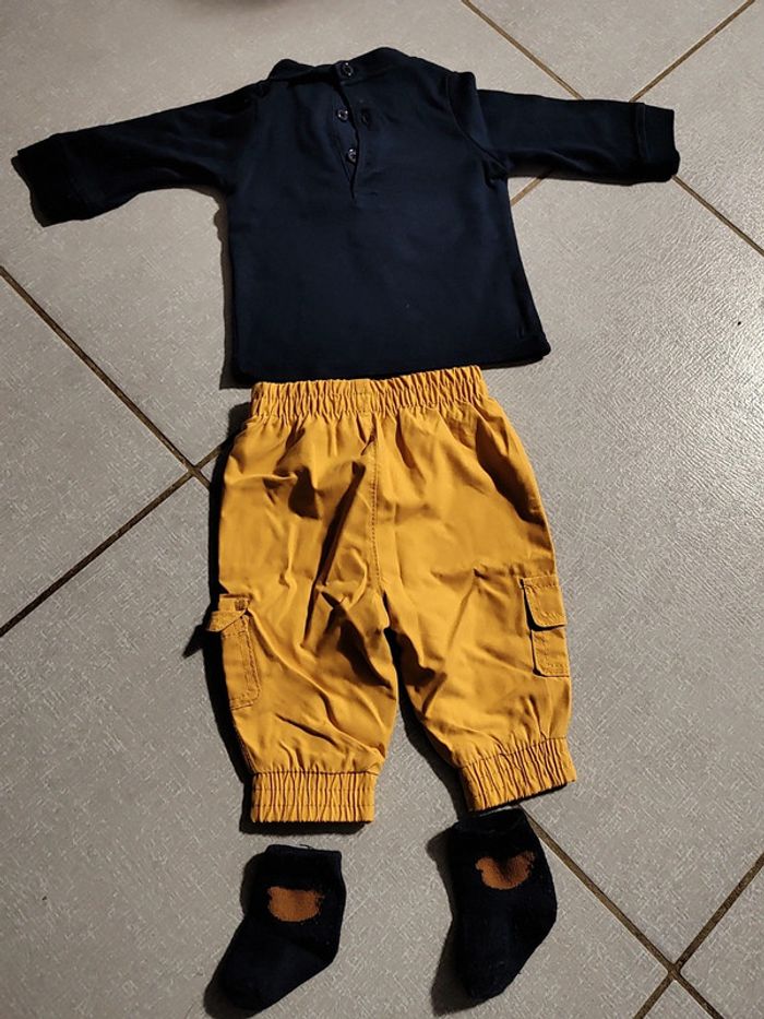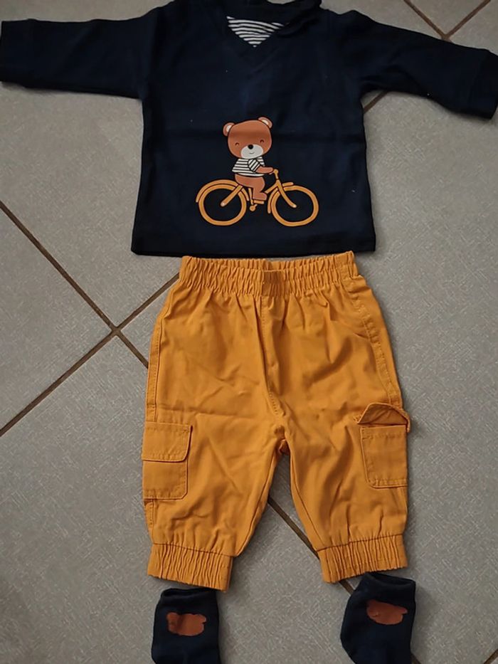 • 1 t-shirt manches longues avec boutons à l'arrière. 60% coton 40% polyester. Motif ours vélo
