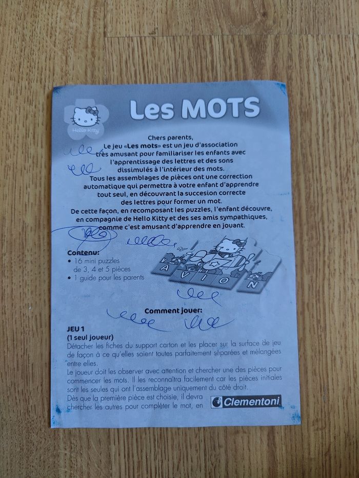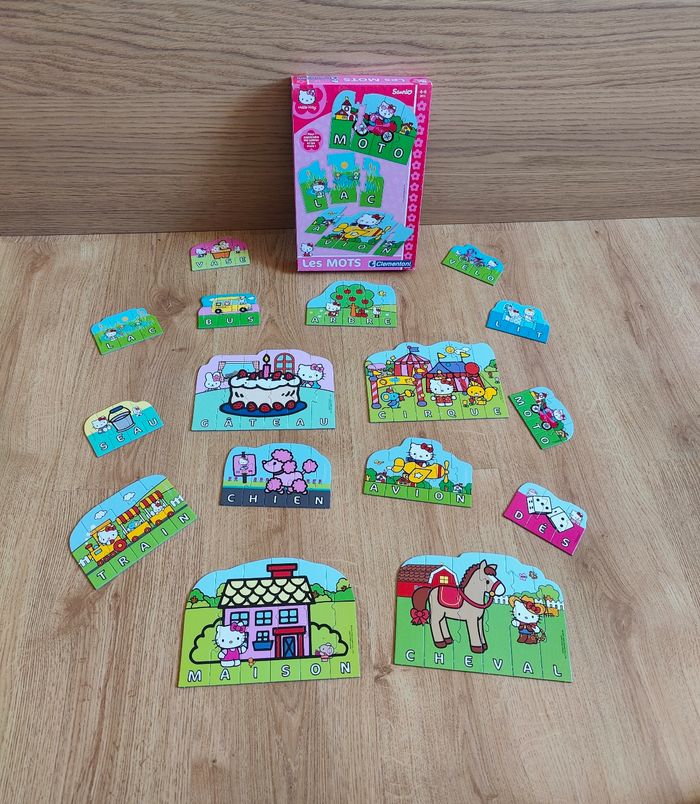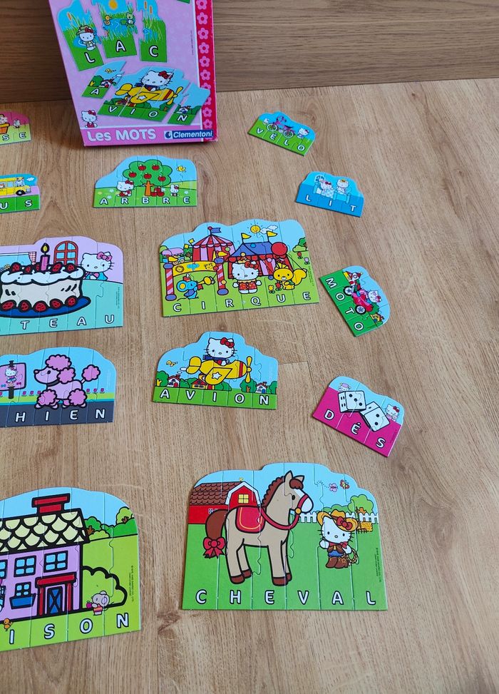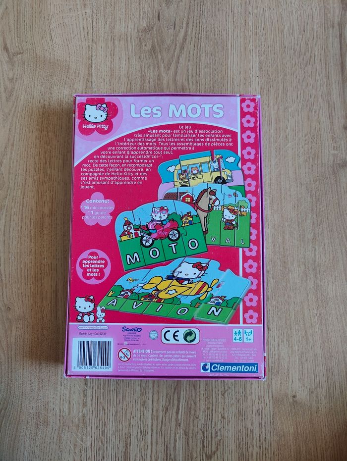 Jeu Les mots Hello Kitty Marque Clementoni Jeu complet Il faut reconstituer les puzzles en formant les mots 16 petits puzzles de différentes tailles En très bon état Boite stockée, aspect moins neuf Trace de stylo sur la notice, non gênante pour jouer. Cf photos