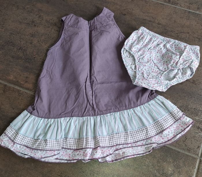 Vend cette jolie robe avec sa culotte pour petite fille âgée de 18 mois. Elle est en parfait état mais son bas prix est dû au fait qu'elle n'ai plus d'étiquette de la marque