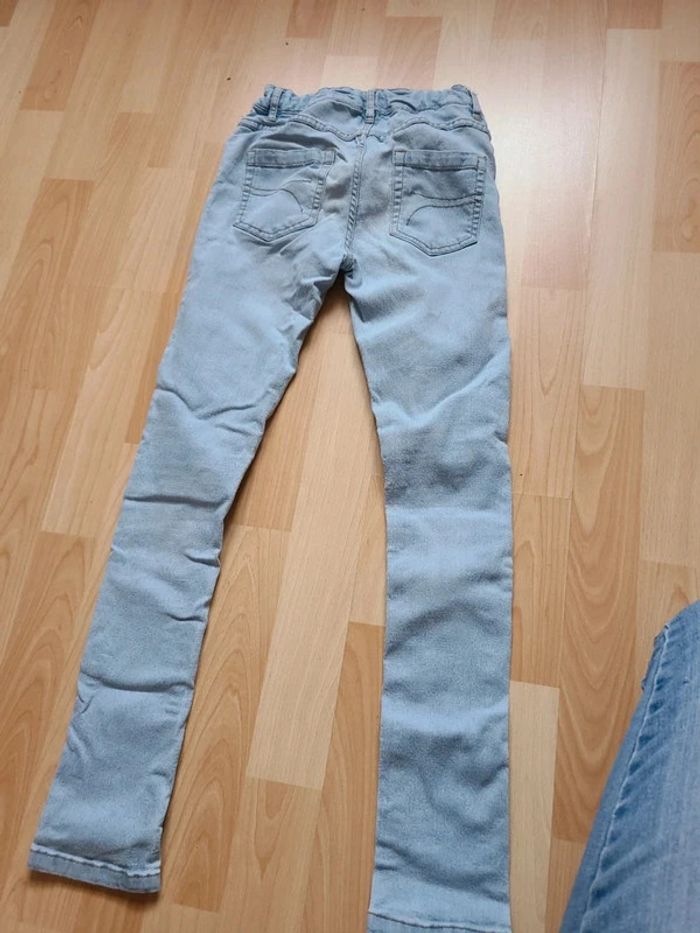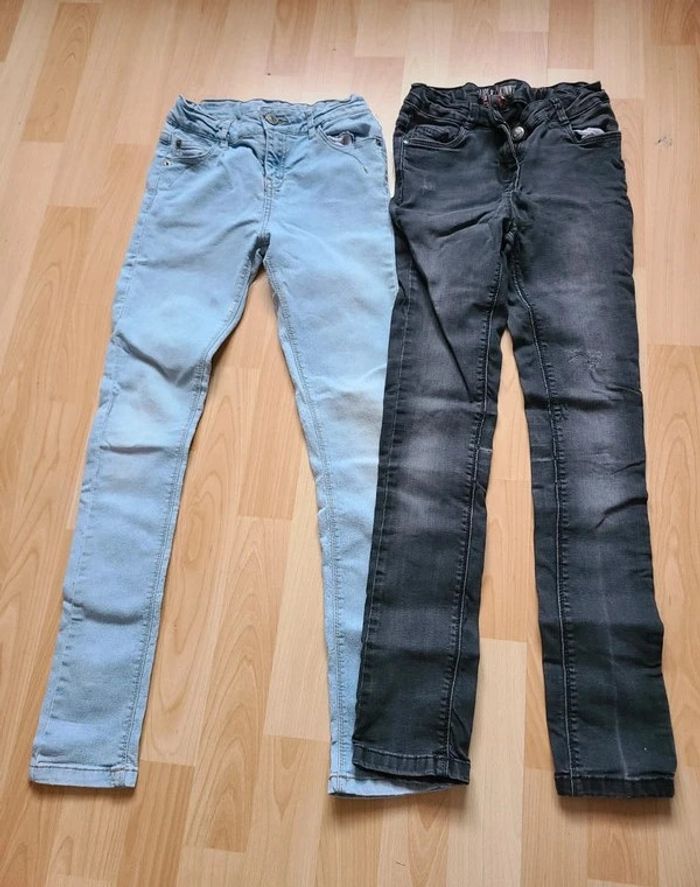 Lot de 2 jeans skinny et ultra skinny. Le bleu clair est en super état, mis à part une légère trace au genou(voir photo). Le gris est un peu plus usé(tissu étiré aux fesses, voir photo). D'où l'esprit de lot a petit prix.😊 Réglable à la taille. Maison non-fumeur Envoi soigné #maddy71fille10ans