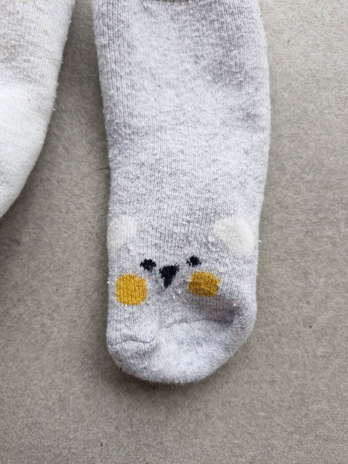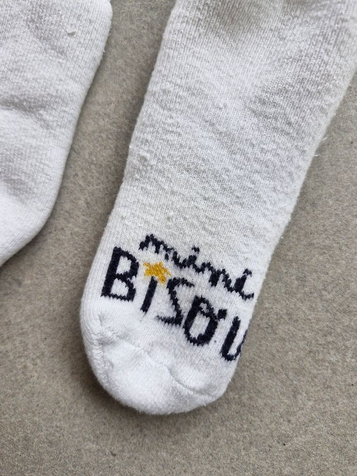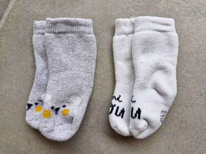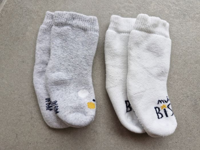 2 paires épaisses et chaudes en 0/6 mois motif ours pour l'une et "mini bisou" pour l'autre. Bébé aura les pieds bien au chaud !