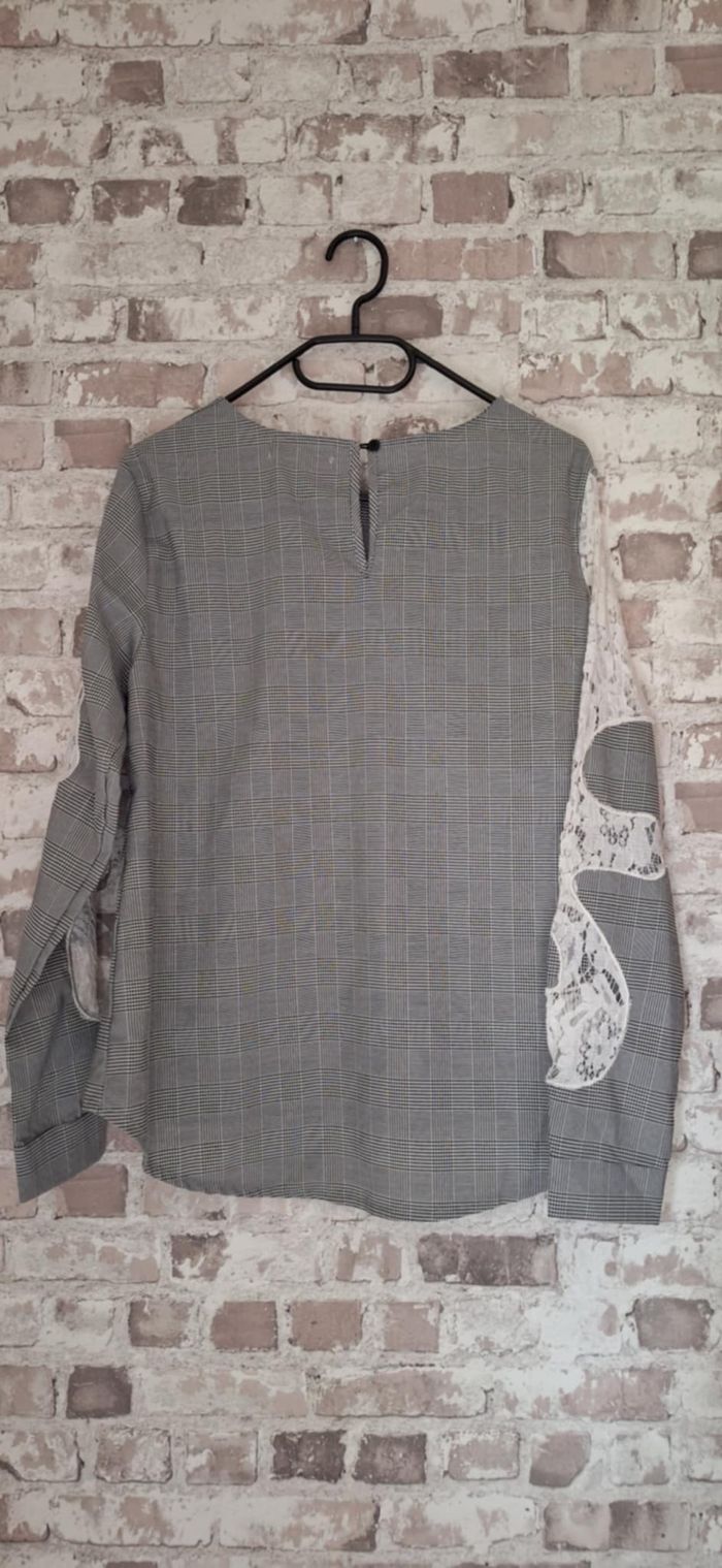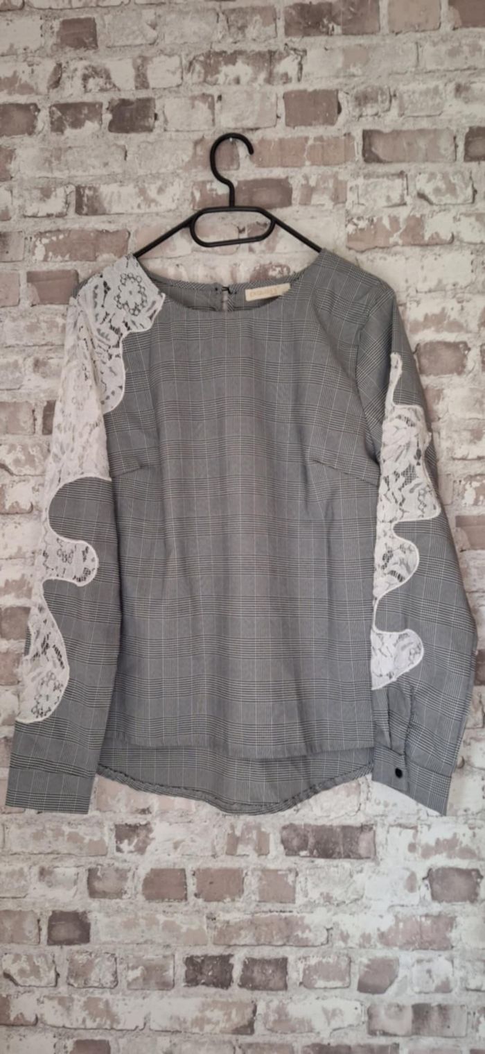 FEMME 38 / M N°2557 Blouse chic Gris , noir Carreaux Dentelle au manche Bouton au dos 100% polyester Taille 38 , m Exquiss's 6,50€ #kelly_femmeT38