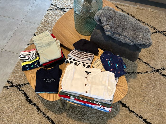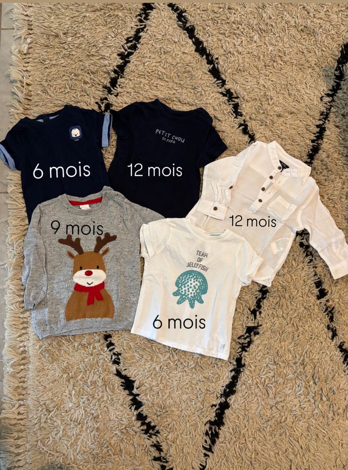 Lot vêtements bébé garçon 9-12 mois: TOUTES MARQUES - 1 combinaison pilote taille 12M - 1 manteau fourrure taille 12M - 1 pyjama 12M (légère tache dans le dos, voir photo) - 1 pyjama de Noël 9-12 M - 1 pyjama 9 M - 2 maillots de bain 9M - 2 bonnets 9-12 M - 1 chapeau 6-12 M - 2 shorts été 12M - 1 salopette 12M - 2 pantalons 12M - 1 jogging 9-12M - 1 ensemble de jogging 9-12M (taché au col du sweat, voir photo) . - 1 pull 9 M - 1 chemise blanche 12M - 2 tee-shirts 6M - 1 tee-shirt 12M Pour les articles sans photos je peux vous les envoyer sur demande.