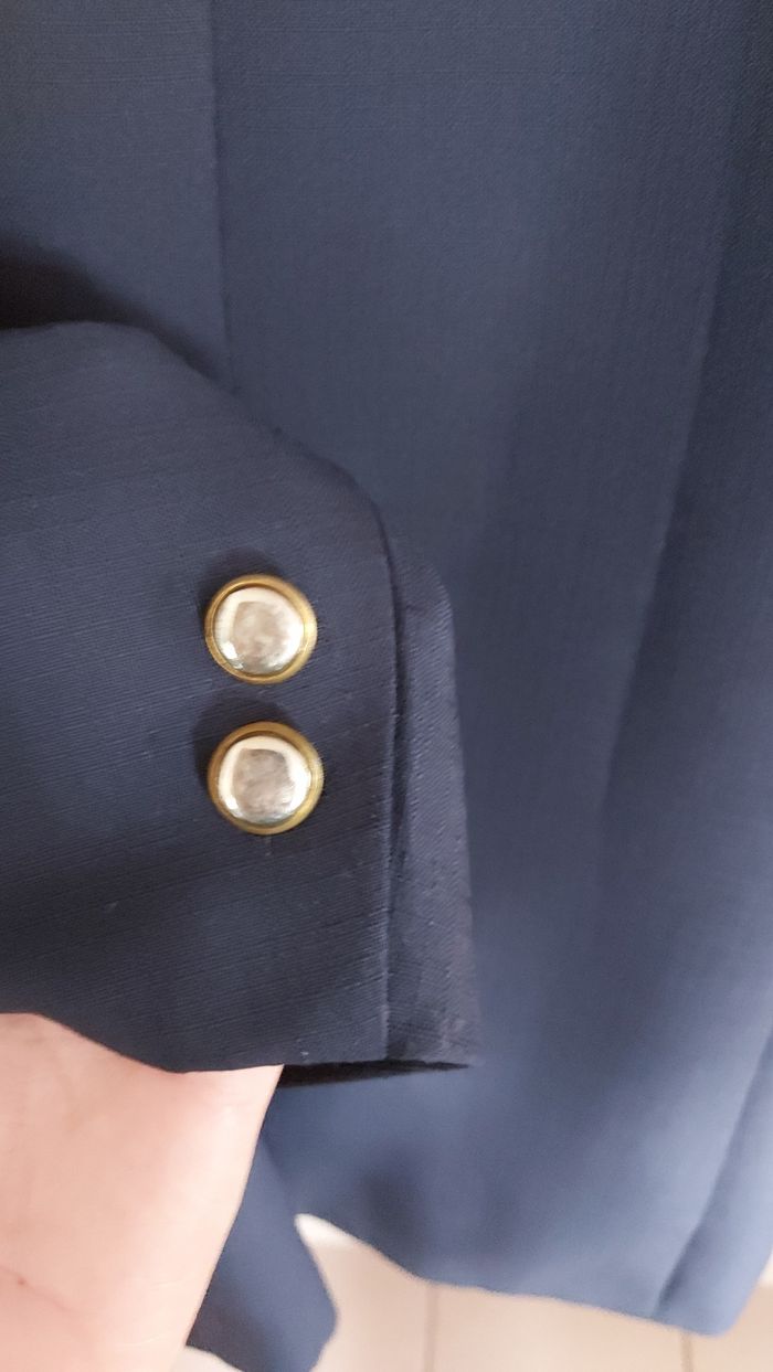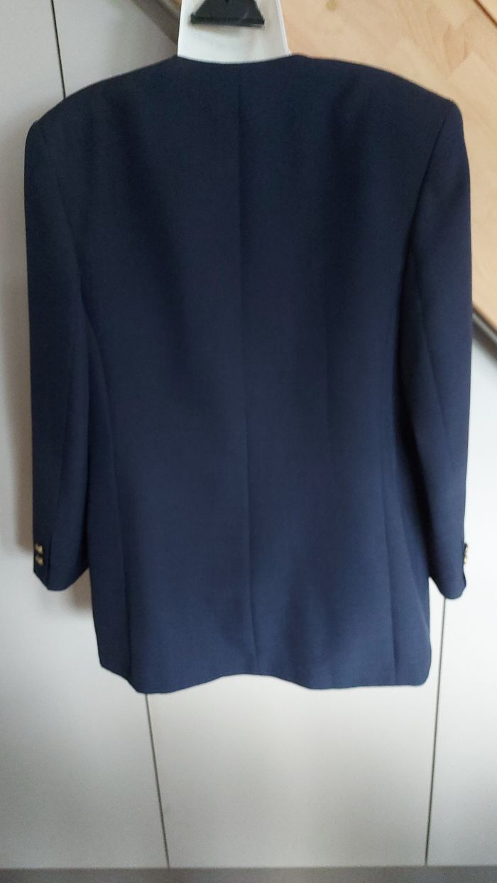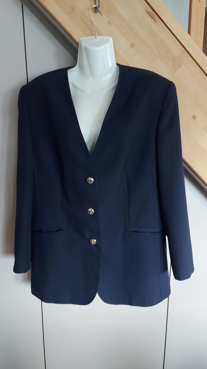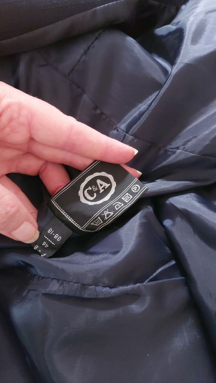 Veste bleue marine, C&A, taille 46. Bon état Sous-bras 53 cm, Longueur 77 cm Un bouton recousu avec un fil de couleur différente mais ne se voit pas