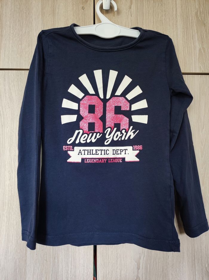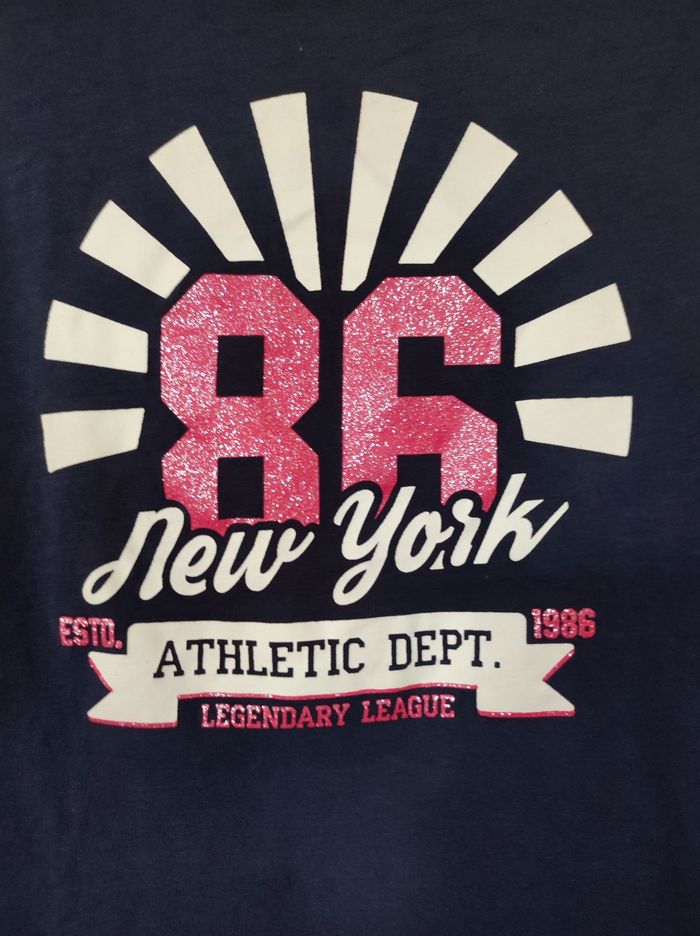 T shirt manches longues / sweatshirt Taille 7-8 ans / 122 128 cm Marque zeeman Col rond , manches longues. Imprimé transfert type sport avec numero rose pailleté et écriture new york athletic dept legendary league 1986. 100 % coton. Parfait état