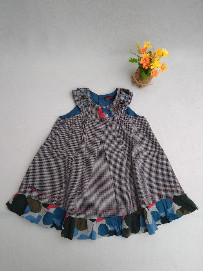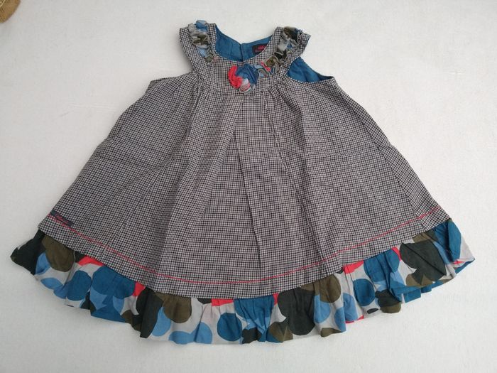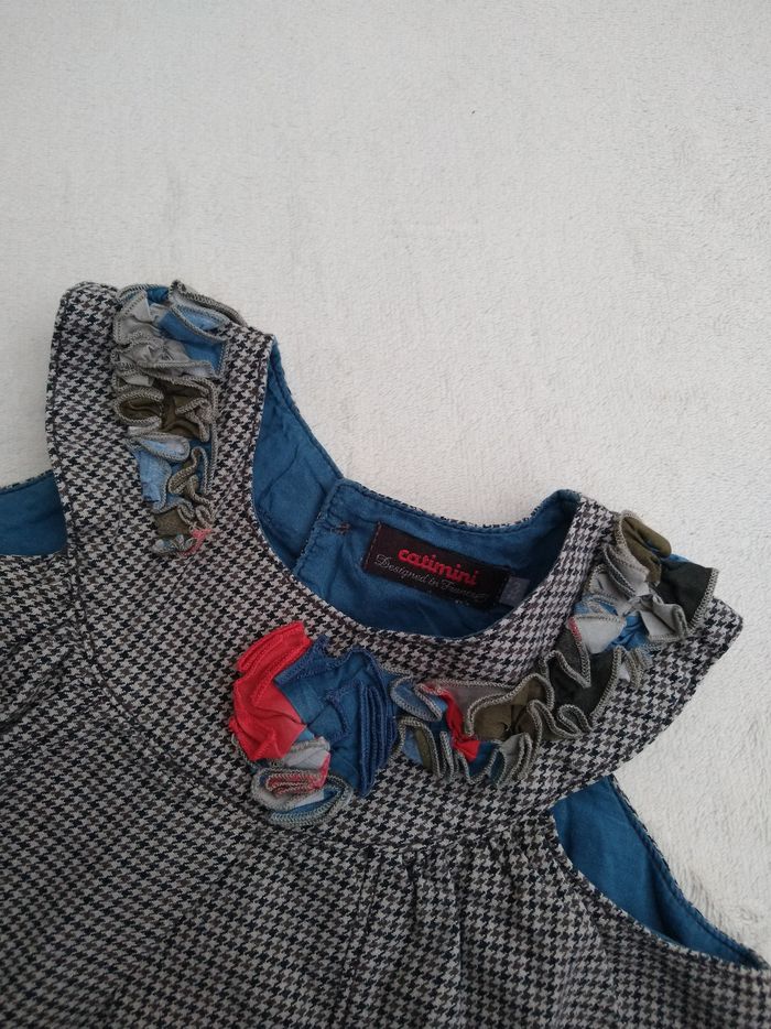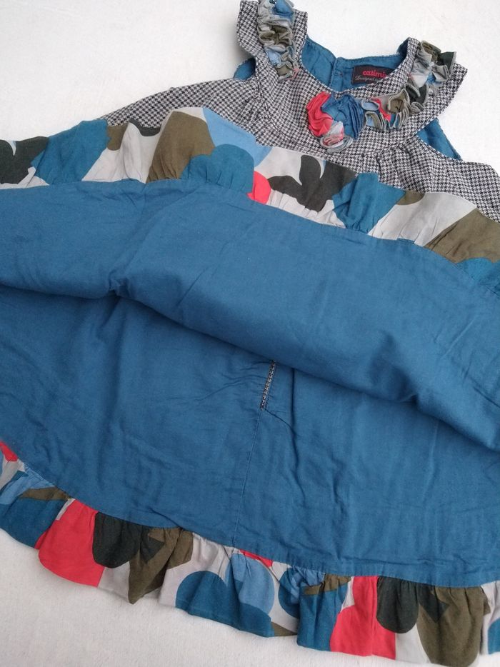 Robe sans manches Marque Catimini Taille 3 ans, 94 cm • Coloris beige, kaki, marine, rouge, bleu • Imprimés pied-de-poule • Volants et fleurs en tissu au col • Bouton au dos • Fronce à l'avant • Premier bouton changé En très bon état #evelyne_filles_3ans #evelyne_filles