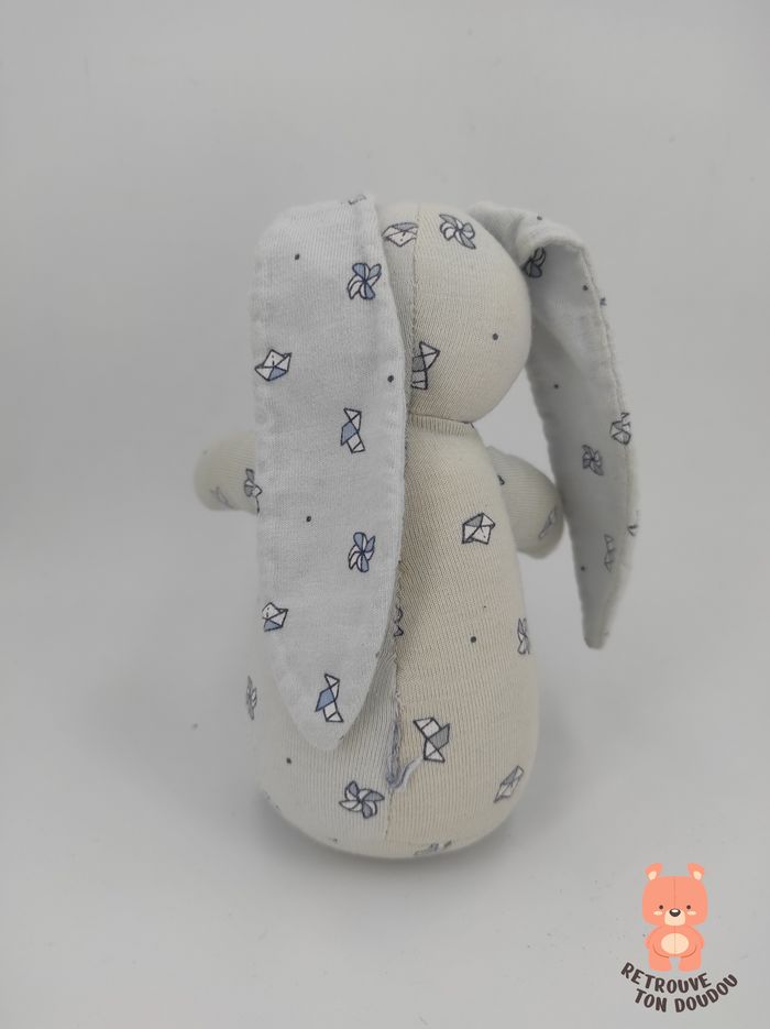 🐇 Doudou Lapin bleu pâle avec motifs d'Origami, Petit Bateau 📏 Dimension : 14 cm environ assis et sans les oreilles ✨ Occasion, correct, manque étiquette, délavé et jauni par endroits 🧼 Lavé avec lessive hypoallergénique 👀 Vous achetez le doudou que vous voyez sur les photos.