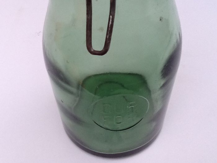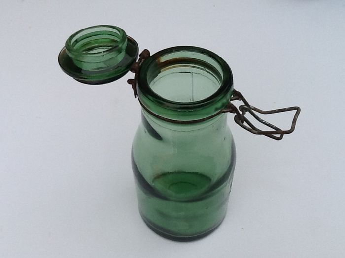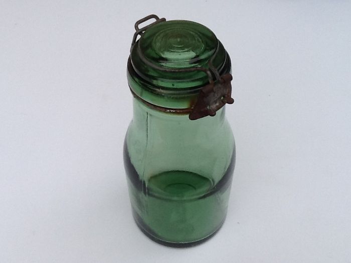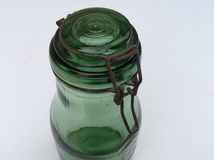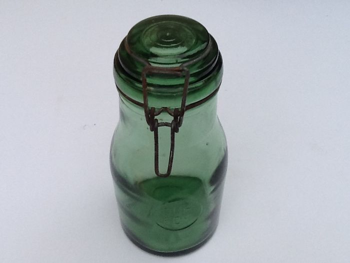 (article vendu en l' état, état d' usage voir toutes les photos) Années 1950 Pot / Bocal DURFOR Verre coloré épais Fermeture métallique Contenance : 1 Litre Hauteur : 225mm Poids : 1kg240
