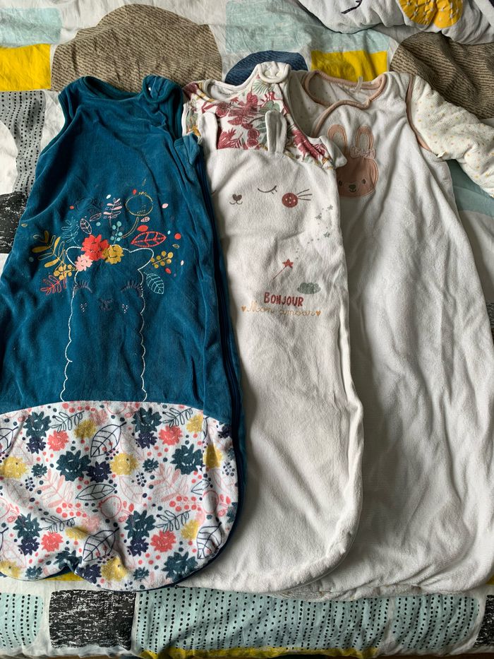 2 gigoteuses petit béguin sans manches en velours, en bon état 1 gigoteuse orchestra avec manches amovibles en bon état Taille 6 à 18 mois pour les 3 #gigoteusestog3 #turbulettes #petitbeguin #orchestra #lot