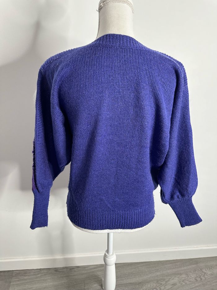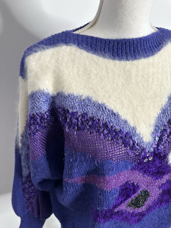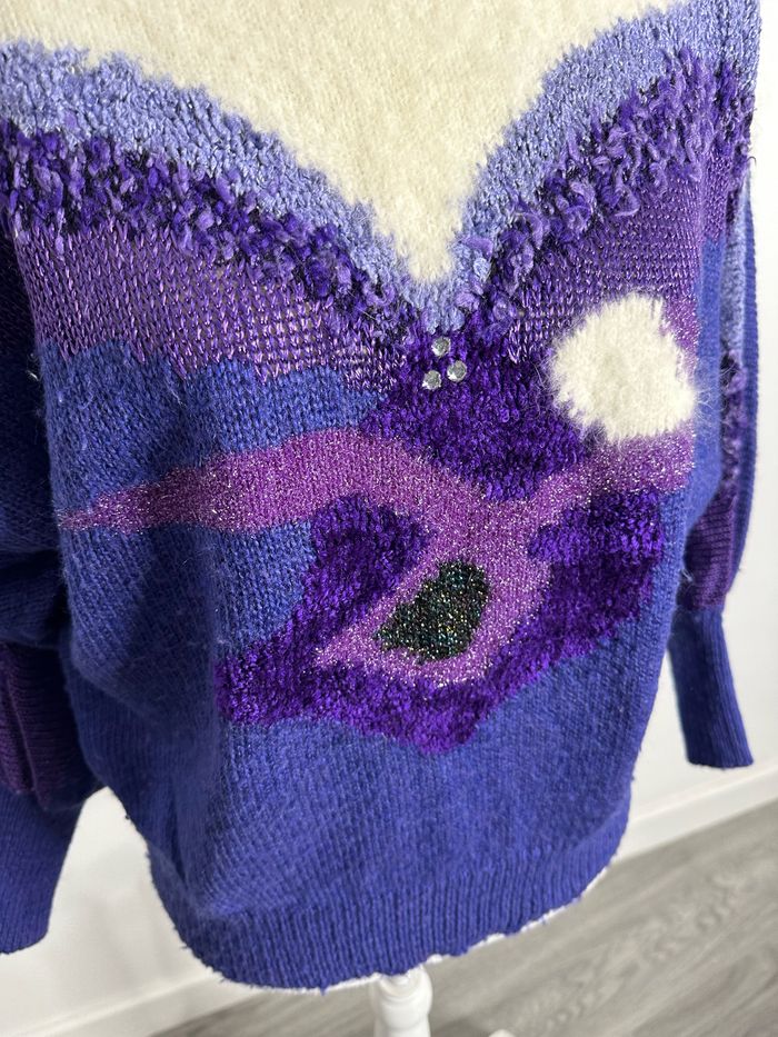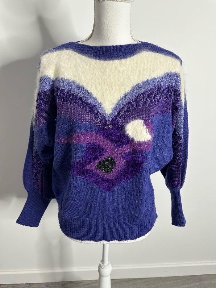 Pull - Excellent état - Taille 40/42 équivalent L/XL - Violet mauve Lila et blanc - En Angora (parties blanches) - Ultra doux et chaud - Vintage, années 80’ - Ajuste au niveau des manches et de la taille - Manches raglans - Pas d’étiquette de taille ni de matière Dimensions: - 68cm niveau aisselles - 60cm de long