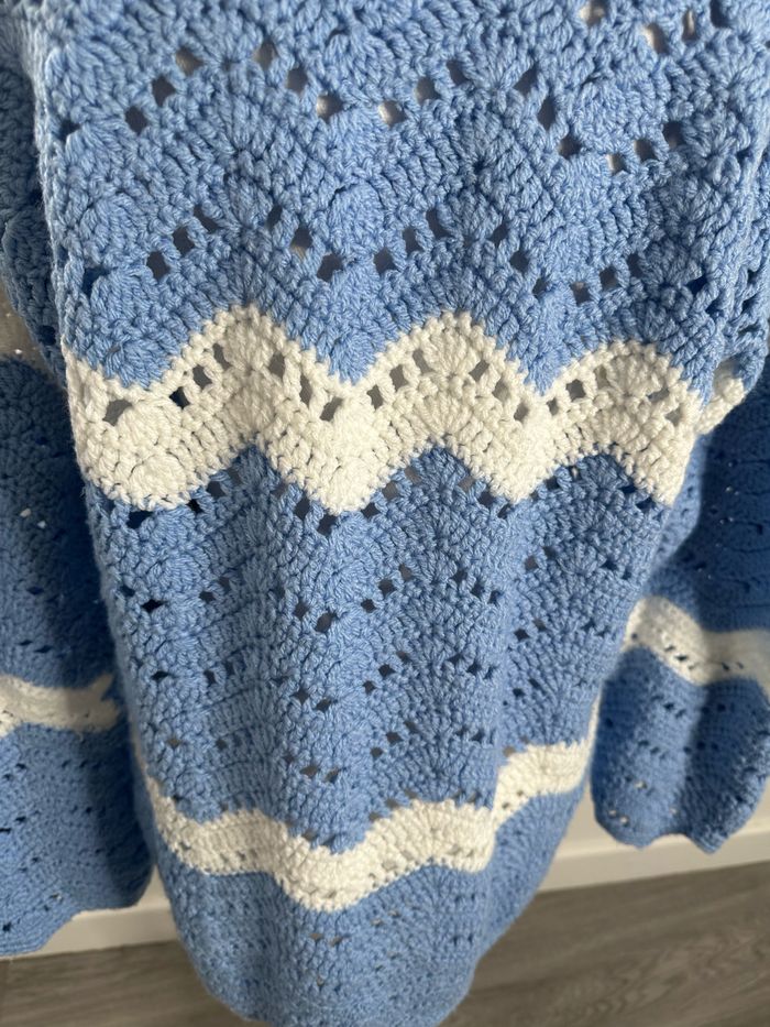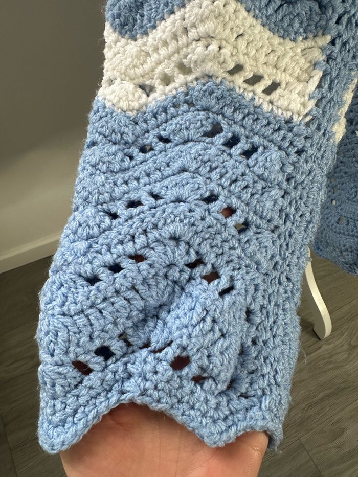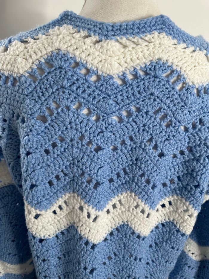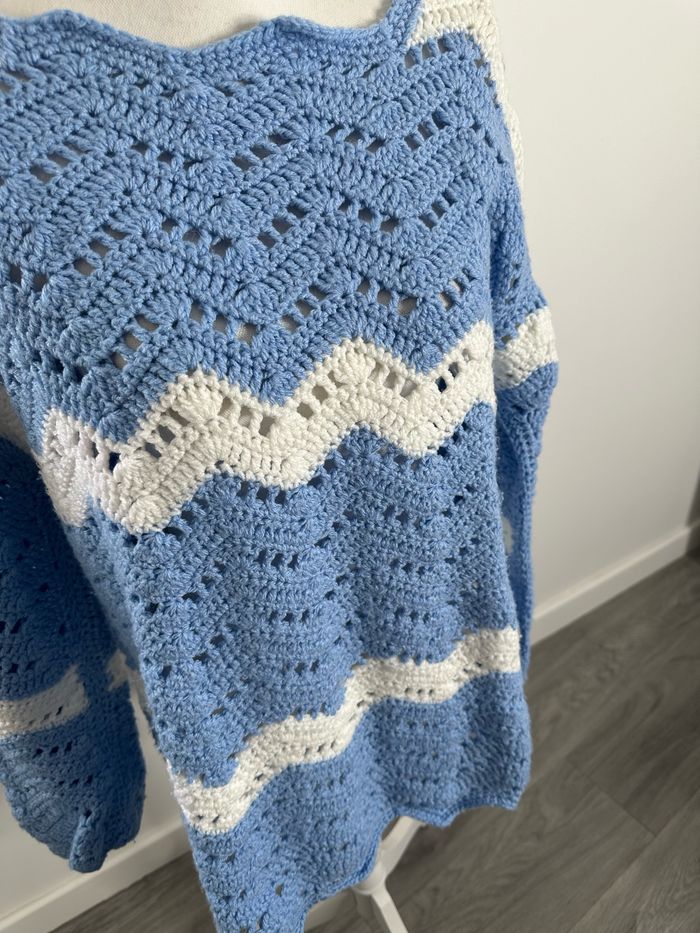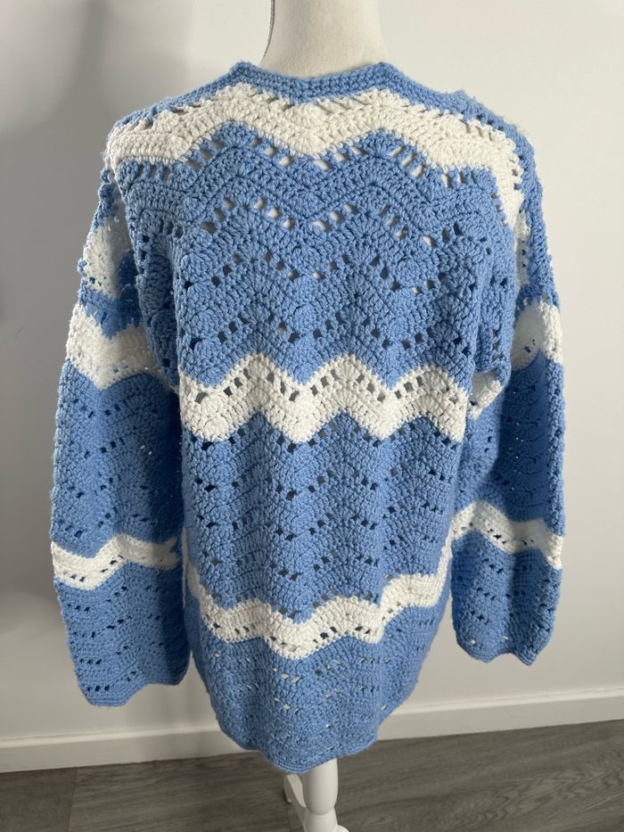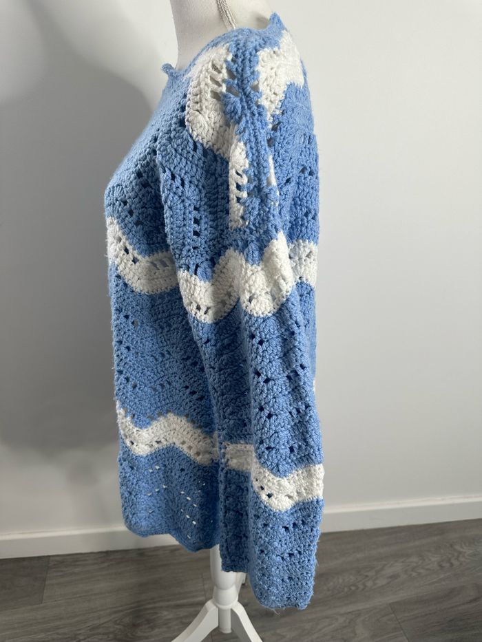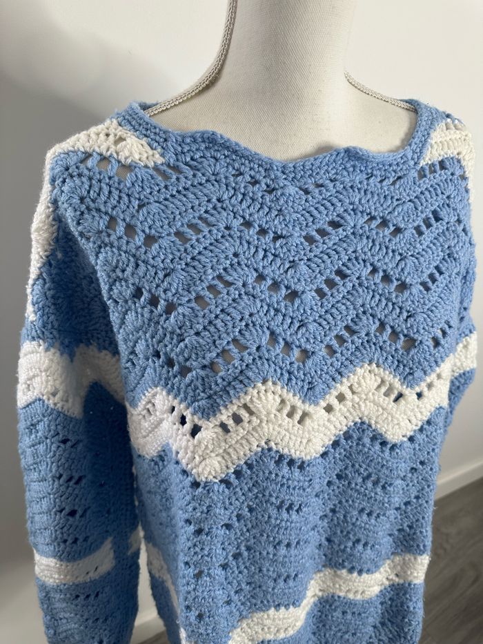 Pull - Excellent état - Taille 42 équivalent XL - Maille ajourée - Bleu clair et blanc - Col et bas feston, festonné - Vintage, années 80-90’ - Pas d’étiquette de taille ni de matière Dimensions: - 60cm niveau aisselles - 74cm de long
