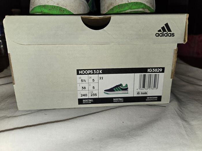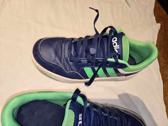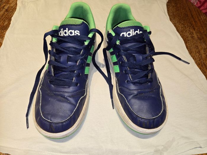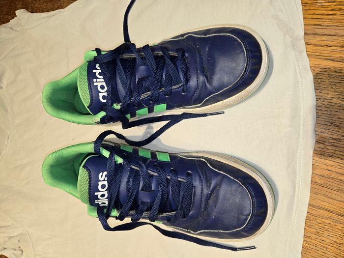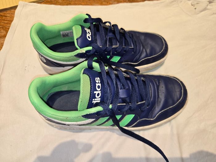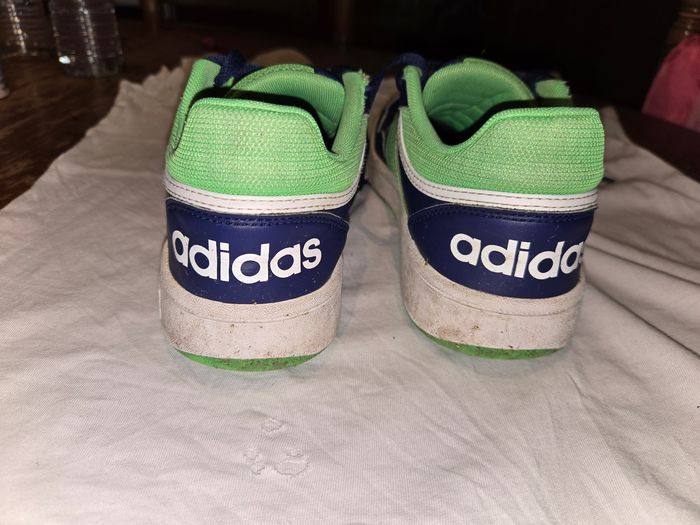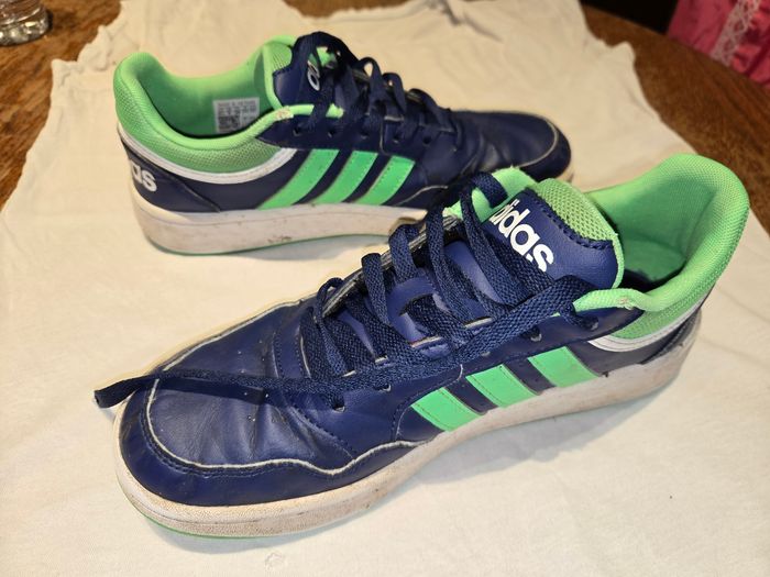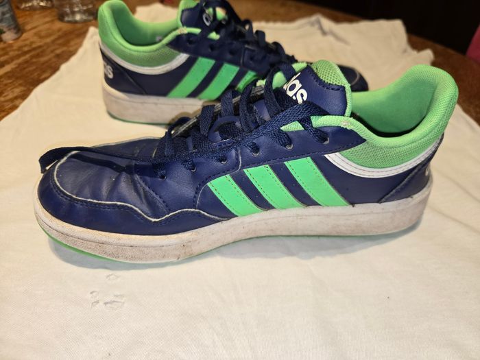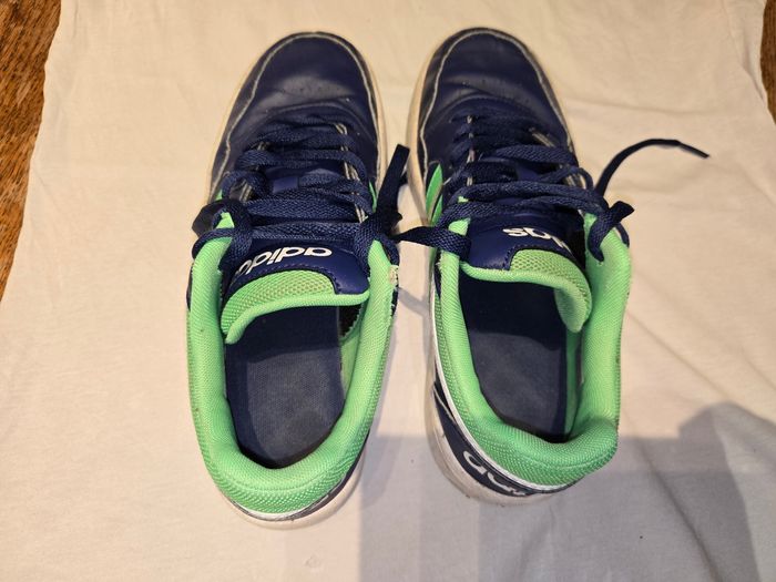 Chaussures Adidas beaucoup portées mais qui peuvent encore faire plaisir. Quelque traces d'usures (photos). Taille 38, taille correctement. Couleur bleu marine et vert presque fluo. Colis dans sa boîte d'origine.