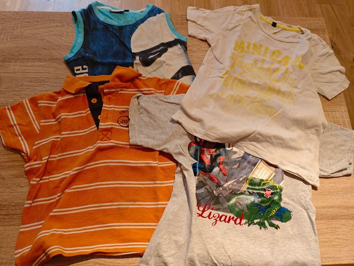 Lot de 4 t-shirts manches courtes ou polo marques Star Wars, Vertbaudet, Marvel et mini gang, en taille 5 ans États divers, petites tâches sur le blanc. Le Star Wars est sans manches, type Marcel