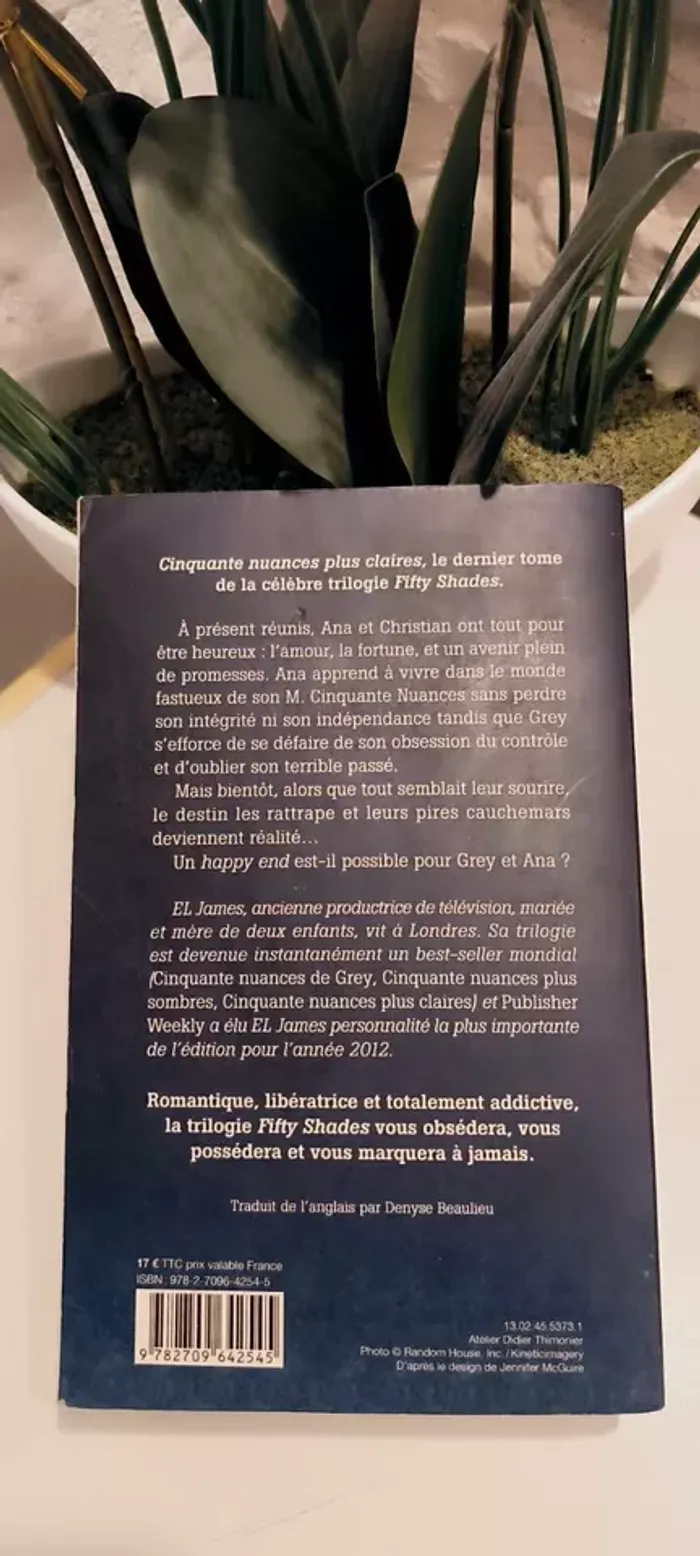 La rencontre d'Ana Steele et de Christian Grey, chef d'entreprise ambitieux mais tourmenté, les a précipités dans une histoire d'amour torride qui a irrémédiablement bouleversé leurs existences. Ana a toujours su que ses amours avec son Cinquante Nuances seraient orageuses : leur vie commune pose des défis que ni l'un ni l'autre n'avaient envisagés. Ana doit apprendre à partager le style de vie opulent de Grey sans sacrifier sa propre intégrité ou son indépendance ; Grey doit surmonter son obsession de tout contrôler, et exorciser les horreurs qui le hantent. Enfin réunis, ils ont tout : l'amour, la passion, l'intimité, la richesse et une infinité de possibles. Mais alors même que la vie les comble, le malheur et le destin conspirent pour plonger Ana dans le pire des cauchemars... Biographie: EL James, ancienne productrice de télévision, mariée et mère de deux enfants, vit à Londres. Sa trilogie est devenue instantanément un best-seller mondial (Cinquante nuances de Grey, Cinquante nuances plus sombres, Cinquante nuances plus claires) et Publisher Weekly a élu EL James personnalité la plus importante de l'édition pour l'année 2012.