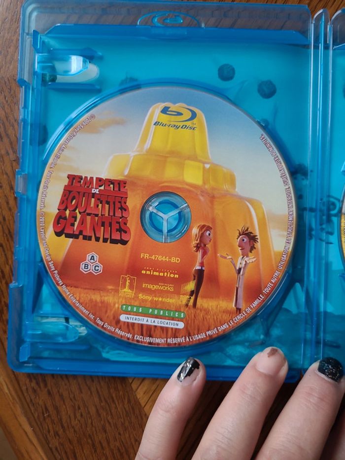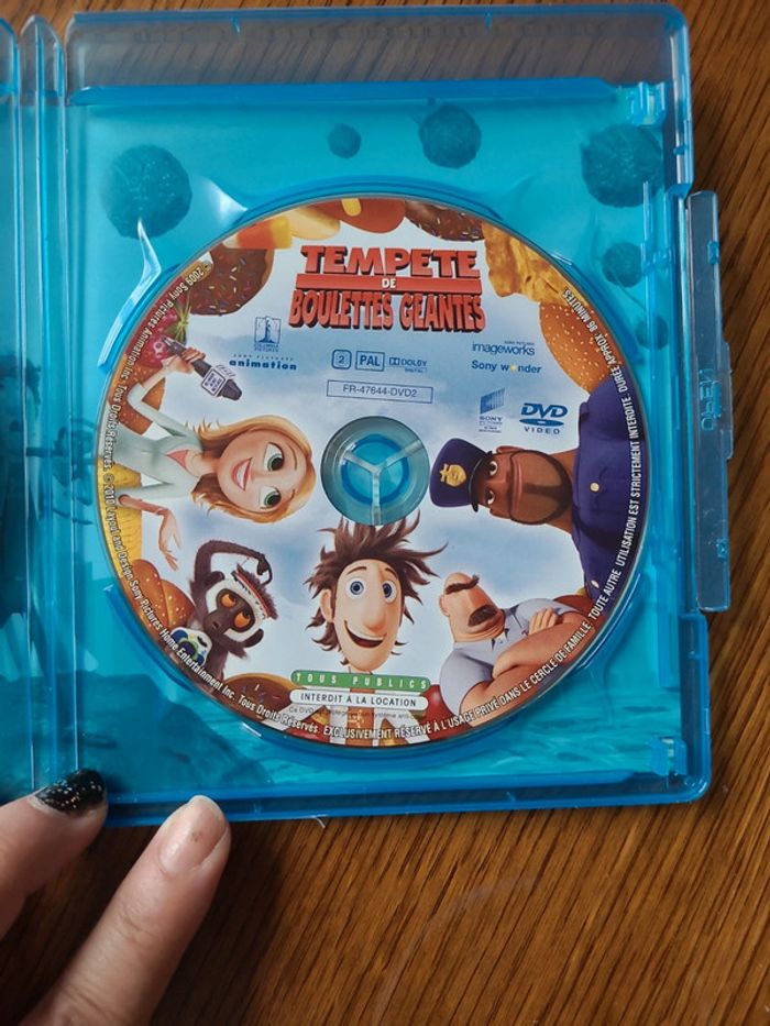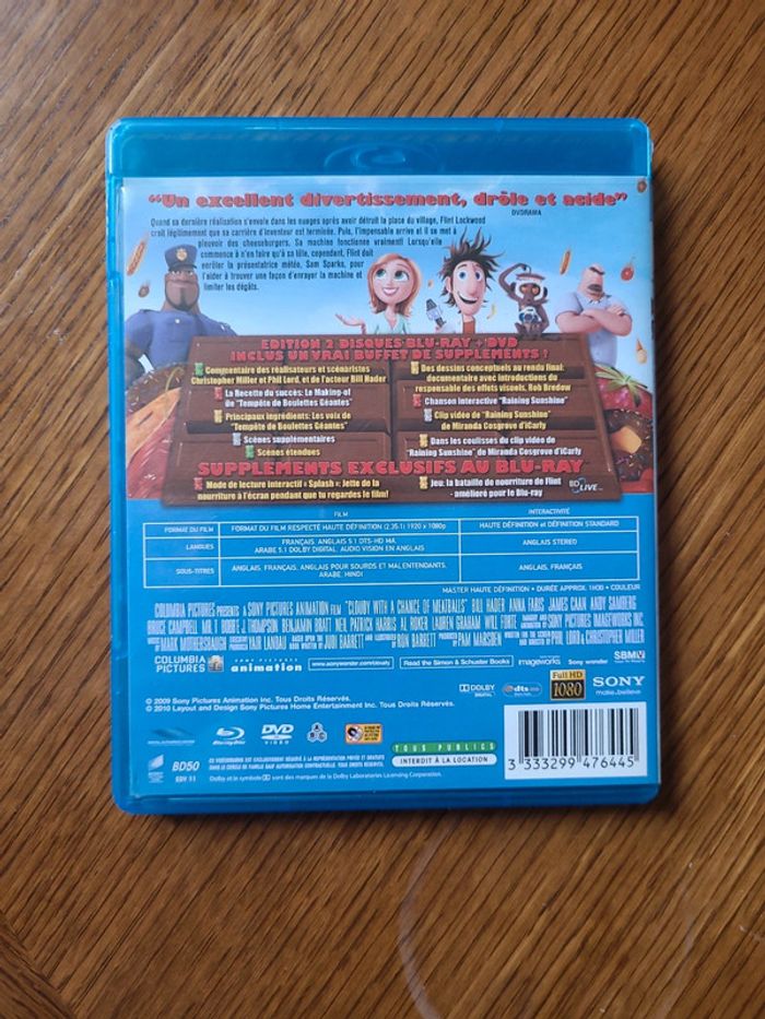 ⬇️mes autres annonces de dvd, blu ray 👉 #cg89dvd 😁 réductions activées des 2 articles ! blu ray et dvd tempête de boulettes géantes (édition spéciale) très bon état Flint Lockwood est inventeur. Jusqu'ici, toutes ses inventions bizarres, depuis les chaussures que l'on se pulvérise sur les pieds jusqu'au traducteur de pensées pour singe, ont été des échecs spectaculaires qui ont causé d'innombrables problèmes à sa petite ville, Swallow en Château. Cette fois, Flint est bien décidé à inventer quelque chose qui rendra les gens heureux. Pourtant, lorsque sa nouvelle création, la machine à transformer l'eau en nourriture, détruit la grand-place avant de disparaître dans les nuages, il pense que sa carrière d'inventeur est définitivement fichue. Jusqu'à ce que l'incroyable se produise : il se met à pleuvoir des cheeseburgers ! Sa machine marche ! Les averses de nourriture connaissent un succès instantané, et Flint se fait vite une nouvelle amie : Sam Sparks, la présentatrice météo qui arrive à Swallow en Château pour couvrir ce qu'elle appelle " le plus formidable phénomène météo de l'histoire "... #animation #aventure #fantastique #comedie #tempete #boulettesgeantes