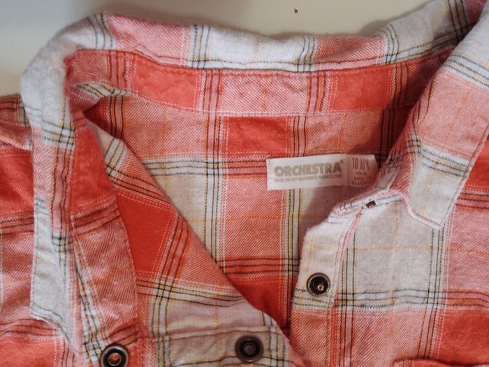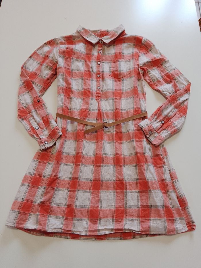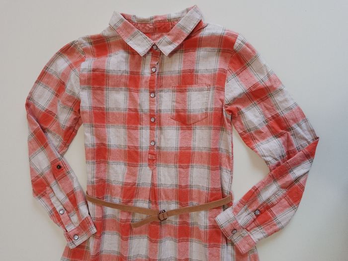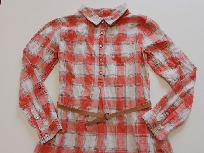 Robe à manches longues pouvant être resserrées par pattes pressionnables, ceinture et fermeture sur le buste par pressions. Le tissu montre des traces d'usure.